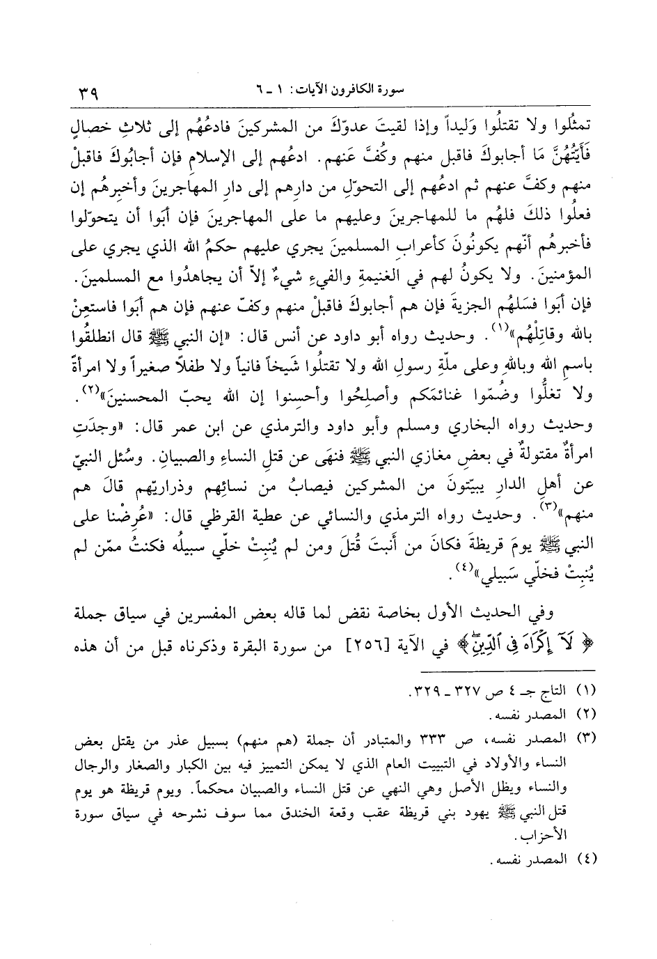 وفي الحديث الأول بخاصة نقض لما قاله بعض المفسرين في سياق جملة لا إِكْراهَ فِي الدِّينِ في الآية [256] من سورة البقرة وذكرناه قبل من أن هذه