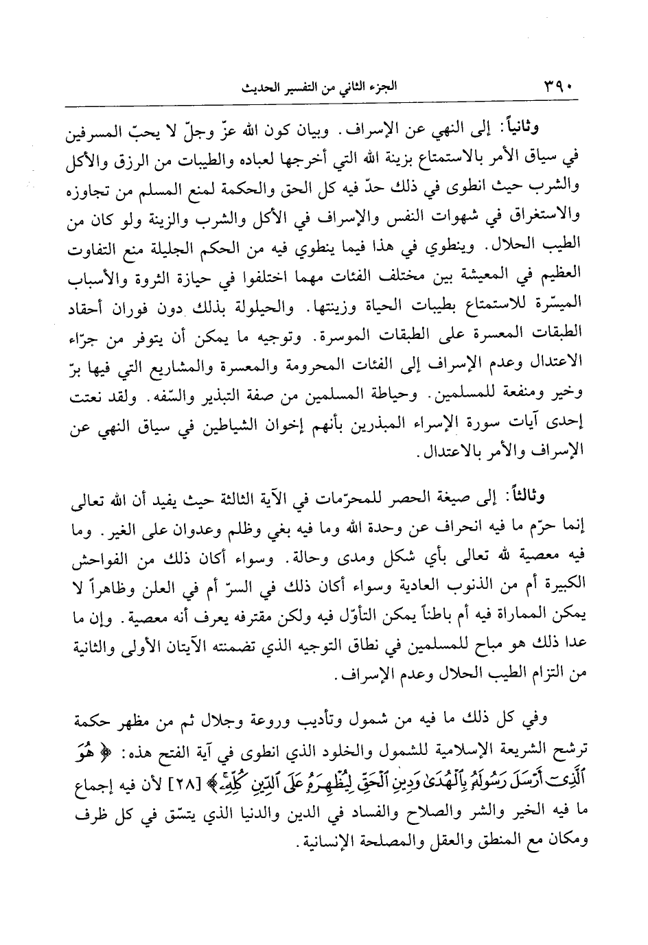 وثانيا: إلى النهي عن الإسراف. وبيان كون الله عزّ وجلّ لا يحبّ المسرفين في سياق الأمر بالاستمتاع بزينة الله التي أخرجها لعباده والطيبات من الرزق والأكل والشرب حيث انطوى في ذلك حدّ فيه كل الحق والحكمة لمنع المسلم من تجاوزه والاستغراق في شهوات النفس والإسراف في الأكل والشرب والزينة ولو كان من الطيب الحلال. وينطوي في هذا فيما ينطوي فيه من الحكم الجليلة منع التفاوت العظيم في المعيشة بين مختلف الفئات مهما اختلفوا في حيازة الثروة والأسباب الميسّرة للاستمتاع بطيبات الحياة وزينتها. والحيلولة بذلك دون فوران أحقاد الطبقات المعسرة على الطبقات الموسرة. وتوجيه ما يمكن أن يتوفر من جرّاء الاعتدال وعدم الإسراف إلى الفئات المحرومة والمعسرة والمشاريع التي فيها برّ وخير ومنفعة للمسلمين. وحياطة المسلمين من صفة التبذير والسّفه. ولقد نعتت إحدى آيات سورة الإسراء المبذرين بأنهم إخوان الشياطين في سياق النهي عن الإسراف والأمر بالاعتدال.