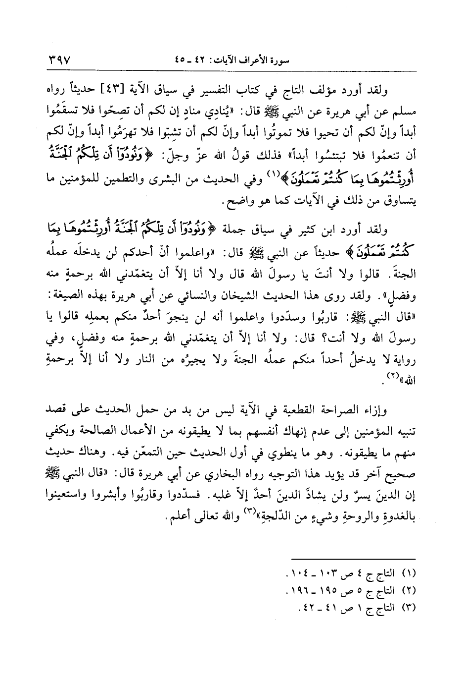 ولقد أورد ابن كثير في سياق جملة وَنُودُوا أَنْ تِلْكُمُ الْجَنَّةُ أُورِثْتُمُوها بِما كُنْتُمْ تَعْمَلُونَ حديثا عن النبي صلّى الله عليه وسلّم قال: «واعلموا أنّ أحدكم لن يدخله عمله الجنة. قالوا ولا أنت يا رسول الله قال ولا أنا إلّا أن يتغمّدني الله برحمة منه وفضل» . ولقد روى هذا الحديث الشيخان والنسائي عن أبي هريرة بهذه الصيغة: