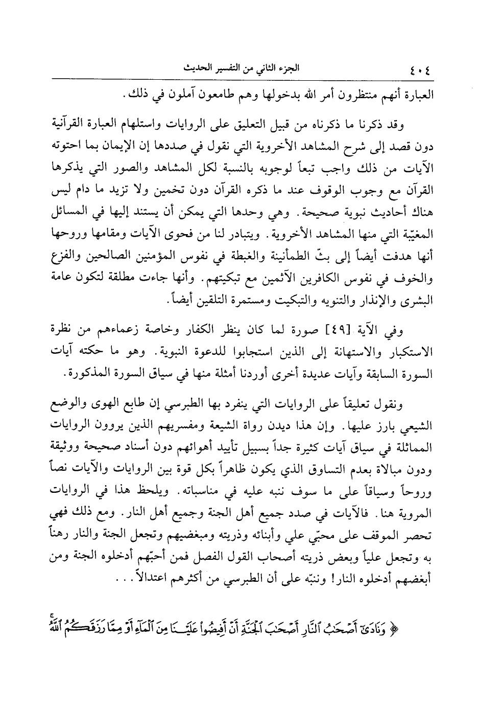 ونقول تعليقا على الروايات التي ينفرد بها الطبرسي إن طابع الهوى والوضع الشيعي بارز عليها. وإن هذا ديدن رواة الشيعة ومفسريهم الذين يروون الروايات المماثلة في سياق آيات كثيرة جدا بسبيل تأييد أهوائهم دون أسناد صحيحة ووثيقة ودون مبالاة بعدم التساوق الذي يكون ظاهرا بكل قوة بين الروايات والآيات نصا وروحا وسياقا على ما سوف ننبه عليه في مناسباته. ويلحظ هذا في الروايات المروية هنا. فالآيات في صدد جميع أهل الجنة وجميع أهل النار. ومع ذلك فهي تحصر الموقف على محبّي علي وأبنائه وذريته ومبغضيهم وتجعل الجنة والنار رهنا به وتجعل عليا وبعض ذريته أصحاب القول الفصل فمن أحبّهم أدخلوه الجنة ومن أبغضهم أدخلوه النار! وننبّه على أن الطبرسي من أكثرهم اعتدالا ...
