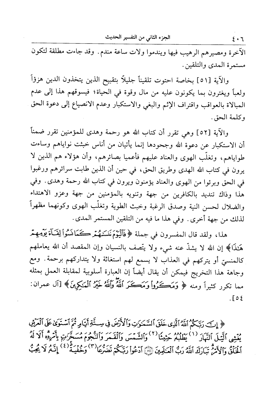 والآية [52] وهي تقرر أن كتاب الله هو رحمة وهدى للمؤمنين تقرر ضمنا أن الاستكبار عن دعوة الله وجحودها إنما يأتيان من أناس خبثت نواياهم وساءت طواياهم، وتغلّب الهوى والعناد عليهم فأعميا بصائرهم، وأن هؤلاء هم الذين لا يرون في كتاب الله الهدى وطريق الحق، في حين أن الذين طابت سرائرهم ورغبوا في الحق وبرئوا من الهوى والعناد يؤمنون ويرون في كتاب الله رحمة وهدى. وفي هذا وذاك تنديد بالكافرين من جهة وتنويه بالمؤمنين من جهة وعزو الاهتداء والضلال لحسن النية وصدق الرغبة وخبث الطوية وتغلّب الهوى وكونهما مظهرا لذلك من جهة أخرى. وفي هذا ما فيه من التلقين المستمر المدى.