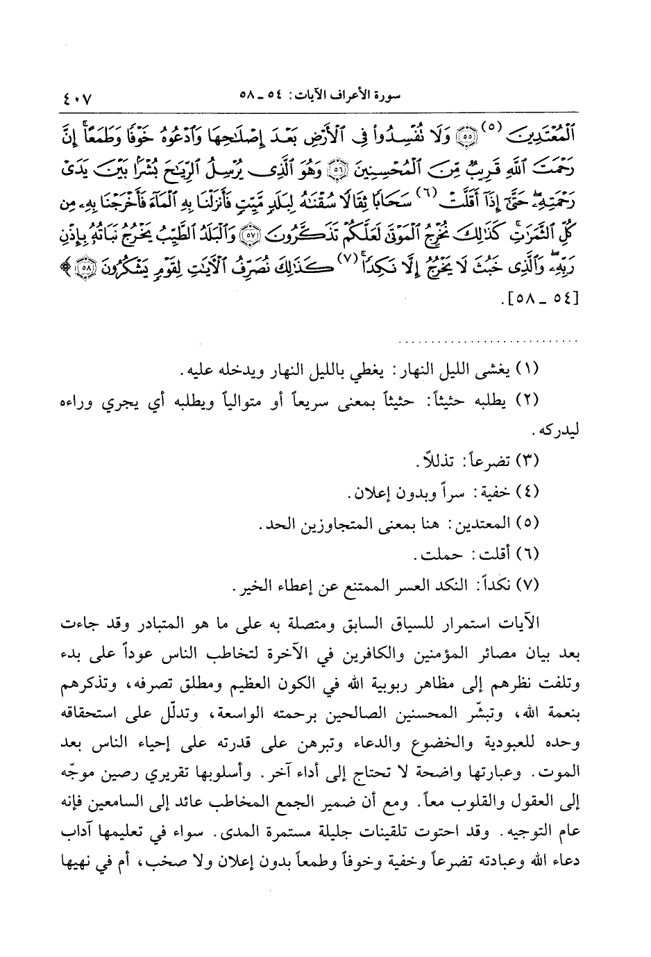 الآيات استمرار للسياق السابق ومتصلة به على ما هو المتبادر وقد جاءت بعد بيان مصائر المؤمنين والكافرين في الآخرة لتخاطب الناس عودا على بدء وتلفت نظرهم إلى مظاهر ربوبية الله في الكون العظيم ومطلق تصرفه، وتذكرهم بنعمة الله، وتبشّر المحسنين الصالحين برحمته الواسعة، وتدلّل على استحقاقه وحده للعبودية والخضوع والدعاء وتبرهن على قدرته على إحياء الناس بعد الموت. وعبارتها واضحة لا تحتاج إلى أداء آخر. وأسلوبها تقريري رصين موجّه إلى العقول والقلوب معا. ومع أن ضمير الجمع المخاطب عائد إلى السامعين فإنه عام التوجيه. وقد احتوت تلقينات جليلة مستمرة المدى. سواء في تعليمها آداب دعاء الله وعبادته تضرعا وخفية وخوفا وطمعا بدون إعلان ولا صخب، أم في نهيها