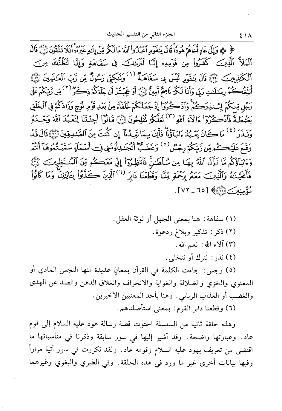 وَإِلى عادٍ أَخاهُمْ هُوداً قالَ يا قَوْمِ اعْبُدُوا اللَّهَ ما لَكُمْ مِنْ إِلهٍ غَيْرُهُ أَفَلا تَتَّقُونَ (65) قالَ الْمَلَأُ الَّذِينَ كَفَرُوا مِنْ قَوْمِهِ إِنَّا لَنَراكَ فِي سَفاهَةٍ وَإِنَّا لَنَظُنُّكَ مِنَ الْكاذِبِينَ (66) قالَ يا قَوْمِ لَيْسَ بِي سَفاهَةٌ وَلكِنِّي رَسُولٌ مِنْ رَبِّ الْعالَمِينَ (67) أُبَلِّغُكُمْ رِسالاتِ رَبِّي وَأَنَا لَكُمْ ناصِحٌ أَمِينٌ (68) أَوَعَجِبْتُمْ أَنْ جاءَكُمْ ذِكْرٌ مِنْ رَبِّكُمْ عَلى رَجُلٍ مِنْكُمْ لِيُنْذِرَكُمْ وَاذْكُرُوا إِذْ جَعَلَكُمْ خُلَفاءَ مِنْ بَعْدِ قَوْمِ نُوحٍ وَزادَكُمْ فِي الْخَلْقِ بَصْطَةً فَاذْكُرُوا آلاءَ اللَّهِ لَعَلَّكُمْ تُفْلِحُونَ (69)