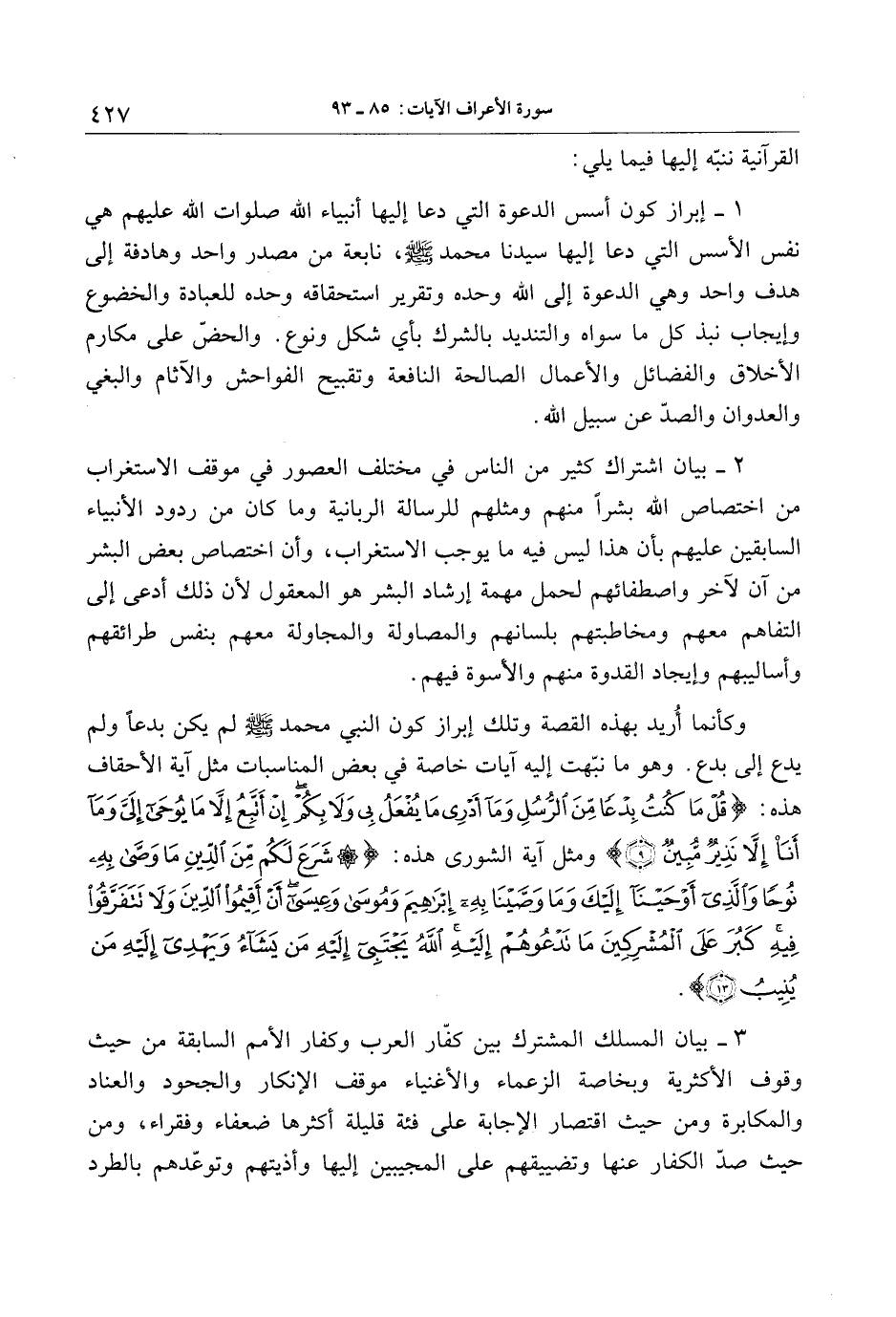 1- إبراز كون أسس الدعوة التي دعا إليها أنبياء الله صلوات الله عليهم هي نفس الأسس التي دعا إليها سيدنا محمد صلّى الله عليه وسلّم، نابعة من مصدر واحد وهادفة إلى هدف واحد وهي الدعوة إلى الله وحده وتقرير استحقاقه وحده للعبادة والخضوع وإيجاب نبذ كل ما سواه والتنديد بالشرك بأي شكل ونوع. والحضّ على مكارم الأخلاق والفضائل والأعمال الصالحة النافعة وتقبيح الفواحش والآثام والبغي والعدوان والصدّ عن سبيل الله.