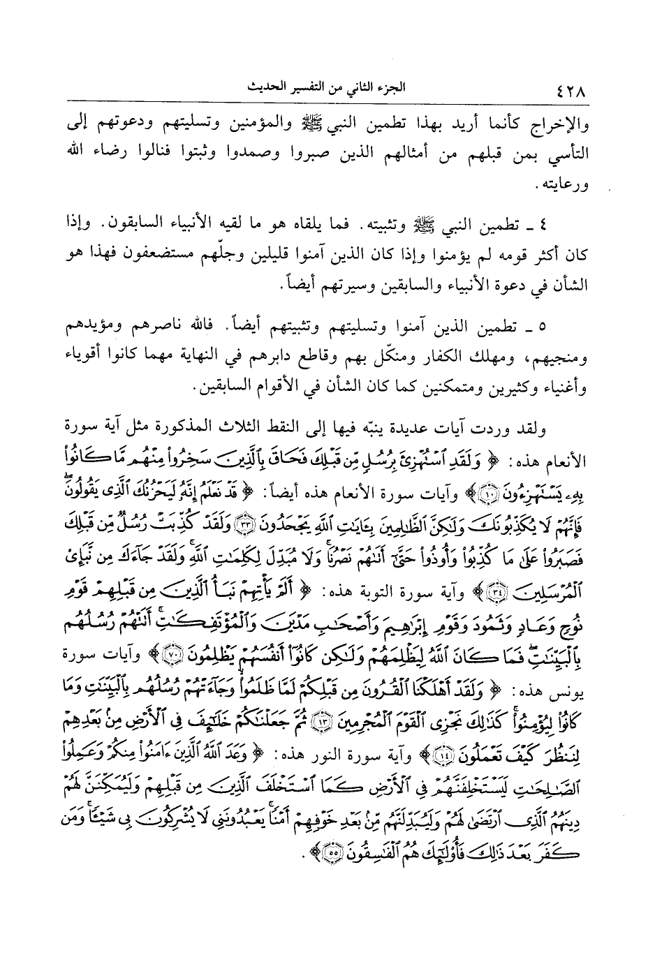 4- تطمين النبي صلّى الله عليه وسلّم وتثبيته. فما يلقاه هو ما لقيه الأنبياء السابقون. وإذا كان أكثر قومه لم يؤمنوا وإذا كان الذين آمنوا قليلين وجلّهم مستضعفون فهذا هو الشأن في دعوة الأنبياء والسابقين وسيرتهم أيضا.