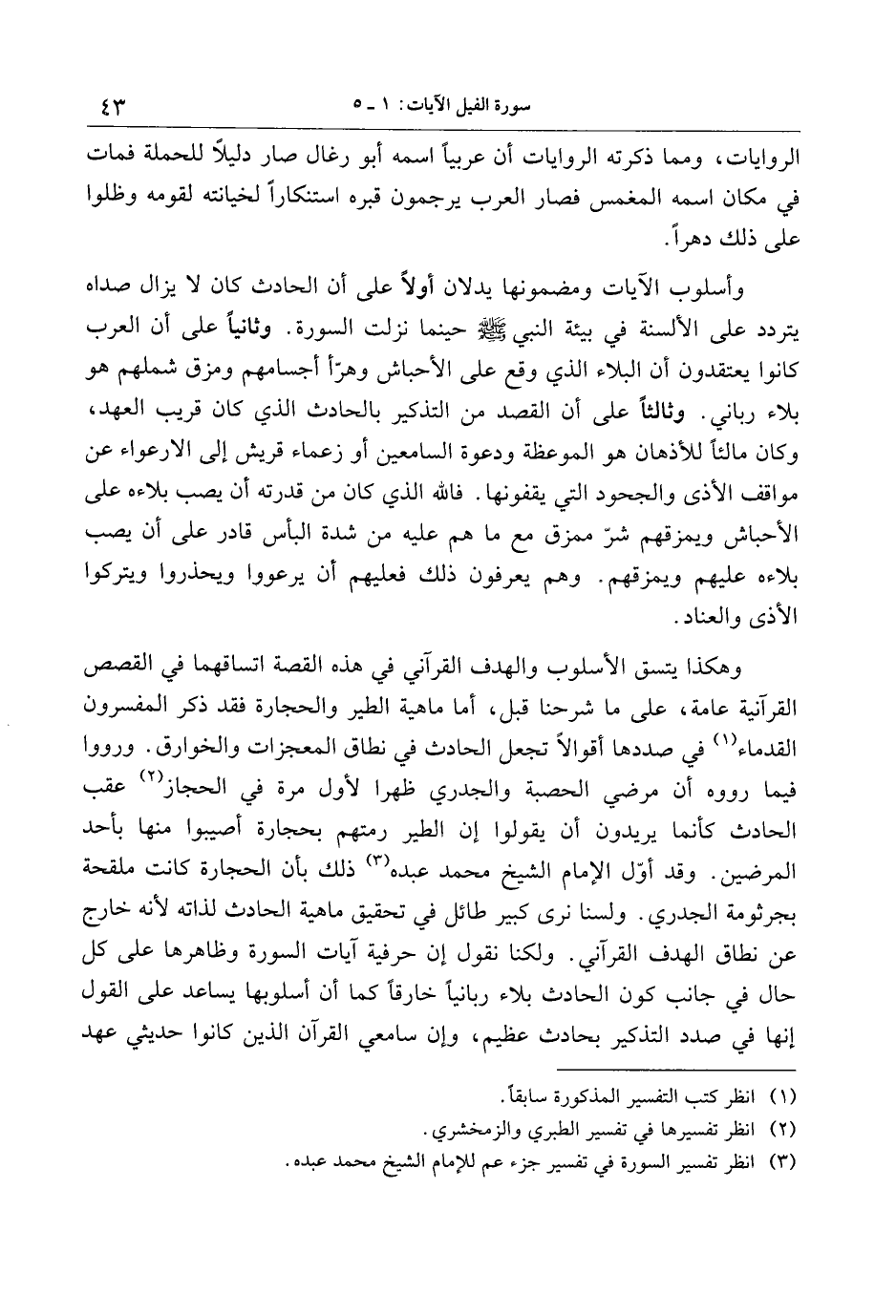 وهكذا يتسق الأسلوب والهدف القرآني في هذه القصة اتساقهما في القصص القرآنية عامة، على ما شرحنا قبل، أما ماهية الطير والحجارة فقد ذكر المفسرون القدماء «1» في صددها أقوالا تجعل الحادث في نطاق المعجزات والخوارق. ورووا فيما رووه أن مرضي الحصبة والجدري ظهرا لأول مرة في الحجاز «2» عقب الحادث كأنما يريدون أن يقولوا إن الطير رمتهم بحجارة أصيبوا منها بأحد المرضين. وقد أوّل الإمام الشيخ محمد عبده «3» ذلك بأن الحجارة كانت ملقحة بجرثومة الجدري. ولسنا نرى كبير طائل في تحقيق ماهية الحادث لذاته لأنه خارج عن نطاق الهدف القرآني. ولكنا نقول إن حرفية آيات السورة وظاهرها على كل حال في جانب كون الحادث بلاء ربانيا خارقا كما أن أسلوبها يساعد على القول إنها في صدد التذكير بحادث عظيم، وإن سامعي القرآن الذين كانوا حديثي عهد