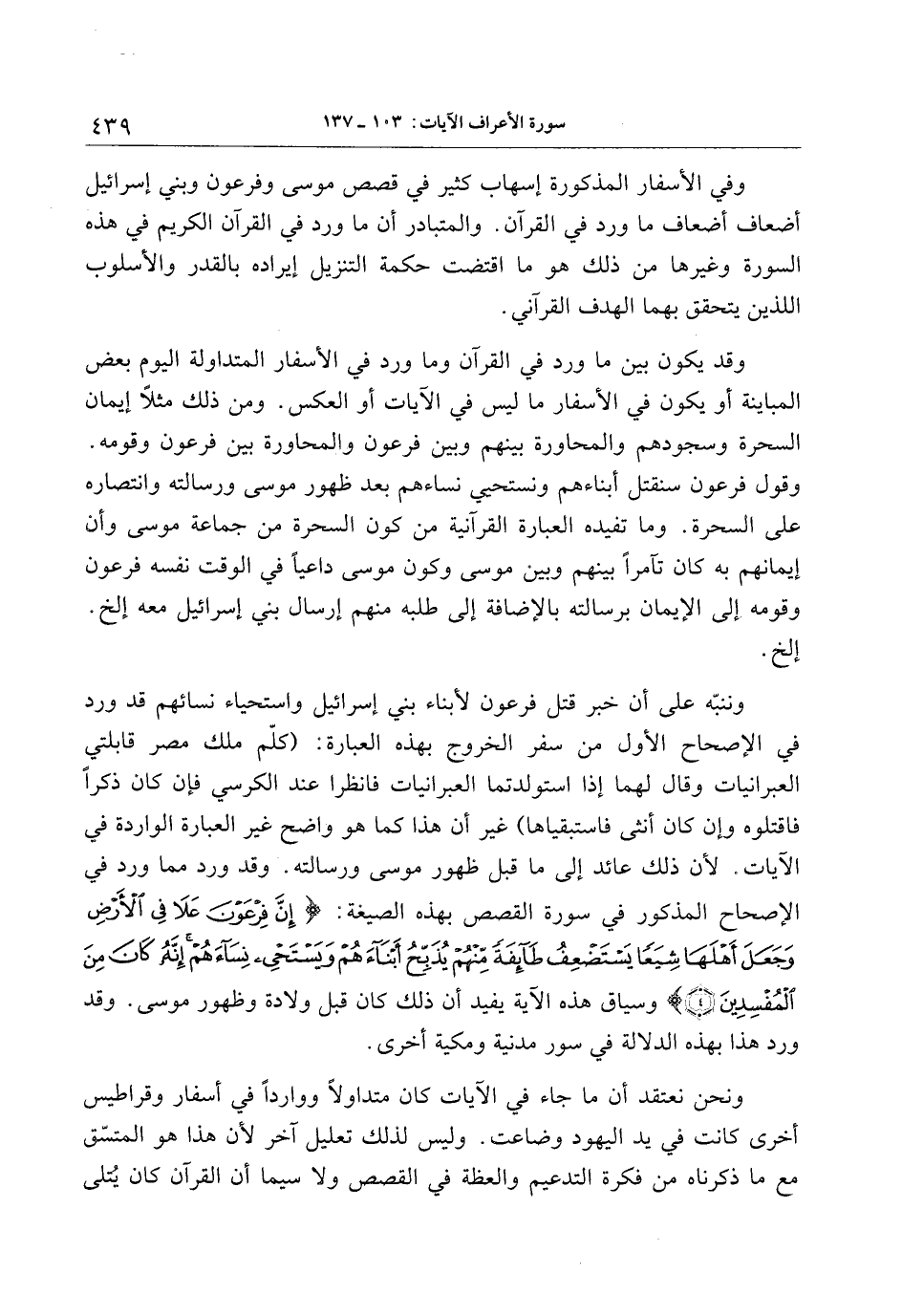 وفي الأسفار المذكورة إسهاب كثير في قصص موسى وفرعون وبني إسرائيل أضعاف أضعاف ما ورد في القرآن. والمتبادر أن ما ورد في القرآن الكريم في هذه السورة وغيرها من ذلك هو ما اقتضت حكمة التنزيل إيراده بالقدر والأسلوب اللذين يتحقق بهما الهدف القرآني.