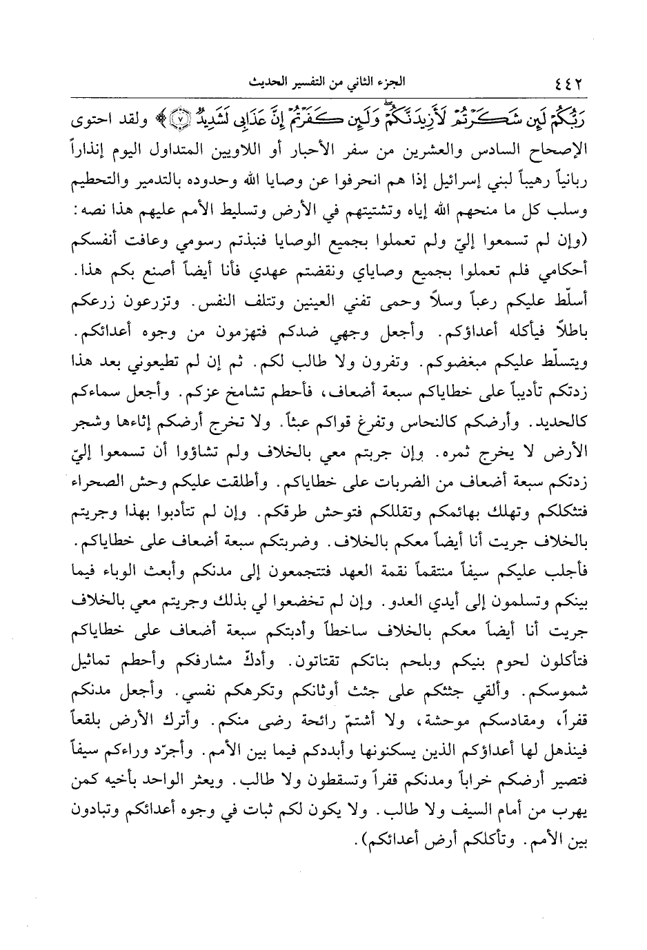 رَبُّكُمْ لَئِنْ شَكَرْتُمْ لَأَزِيدَنَّكُمْ وَلَئِنْ كَفَرْتُمْ إِنَّ عَذابِي لَشَدِيدٌ (7) ولقد احتوى الإصحاح السادس والعشرين من سفر الأحبار أو اللاويين المتداول اليوم إنذارا ربانيا رهيبا لبني إسرائيل إذا هم انحرفوا عن وصايا الله وحدوده بالتدمير والتحطيم وسلب كل ما منحهم الله إياه وتشتيتهم في الأرض وتسليط الأمم عليهم هذا نصه: