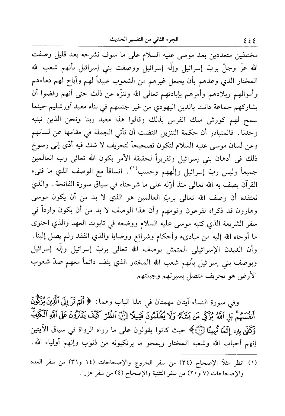 وفي سورة النساء آيتان مهمتان في هذا الباب وهما: أَلَمْ تَرَ إِلَى الَّذِينَ يُزَكُّونَ أَنْفُسَهُمْ بَلِ اللَّهُ يُزَكِّي مَنْ يَشاءُ وَلا يُظْلَمُونَ فَتِيلًا (49) انْظُرْ كَيْفَ يَفْتَرُونَ عَلَى اللَّهِ الْكَذِبَ وَكَفى بِهِ إِثْماً مُبِيناً (50) حيث كانوا يقولون على ما رواه الرواة في سياق الآيتين إنهم أحباب الله وشعبه المختار ويمحو ما يرتكبونه من ذنوب وإنهم أولياء الله.