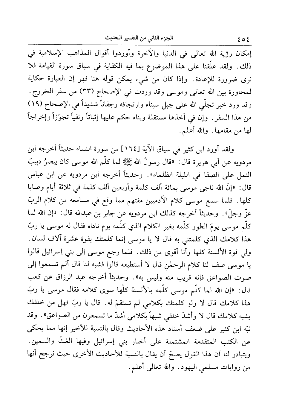 ولقد أورد ابن كثير في سياق الآية [164] من سورة النساء حديثا أخرجه ابن مردويه عن أبي هريرة قال: «قال رسول الله صلّى الله عليه وسلّم لما كلّم الله موسى كان يبصر دبيب النمل على الصفا في الليلة الظلماء» . وحديثا أخرجه ابن مردويه عن ابن عباس قال: «إنّ الله ناجى موسى بمائة ألف كلمة وأربعين ألف كلمة في ثلاثة أيام وصايا كلها. فلما سمع موسى كلام الآدميين مقتهم مما وقع في مسامعه من كلام الربّ عزّ وجلّ» . وحديثا أخرجه كذلك ابن مردويه عن جابر بن عبد الله قال: «إن الله لما كلّم موسى يوم الطور كلّمه بغير الكلام الذي كلّمه يوم ناداه فقال له موسى يا ربّ هذا كلامك الذي كلمتني به قال لا يا موسى إنما كلمتك بقوة عشرة آلاف لسان.
