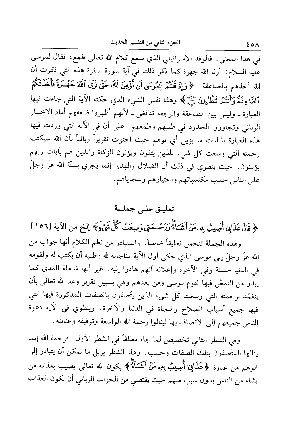 في هذا المعنى. فالوفد الإسرائيلي الذي سمع كلام الله تعالى طمع، فقال لموسى عليه السلام: أرنا الله جهرة كما ذكر ذلك في آية سورة البقرة هذه التي ذكرت أن الله أخذهم بالصاعقة: وَإِذْ قُلْتُمْ يا مُوسى لَنْ نُؤْمِنَ لَكَ حَتَّى نَرَى اللَّهَ جَهْرَةً فَأَخَذَتْكُمُ الصَّاعِقَةُ وَأَنْتُمْ تَنْظُرُونَ (55) وهذا نفس الشيء الذي حكته الآية التي جاءت فيها العبارة- وليس بين الصاعقة والرجفة تناقض- لأنهم أظهروا ضعفهم أمام الاختبار الرباني وتجاوزوا الحدود في طلبهم وطمعهم. على أن في الآية التي وردت فيها هذه العبارة بالذات ما يزيل أي توهم حيث احتوت تقريرا ربانيا بأن الله سيكتب رحمته التي وسعت كل شيء للذين يتقون ويؤتون الزكاة والذين هم بآيات ربهم يؤمنون. حيث ينطوي في ذلك أن الضلال والهدى إنما يجري بسنّة الله عزّ وجلّ على الناس حسب مكتسباتهم واختيارهم وسجاياهم.