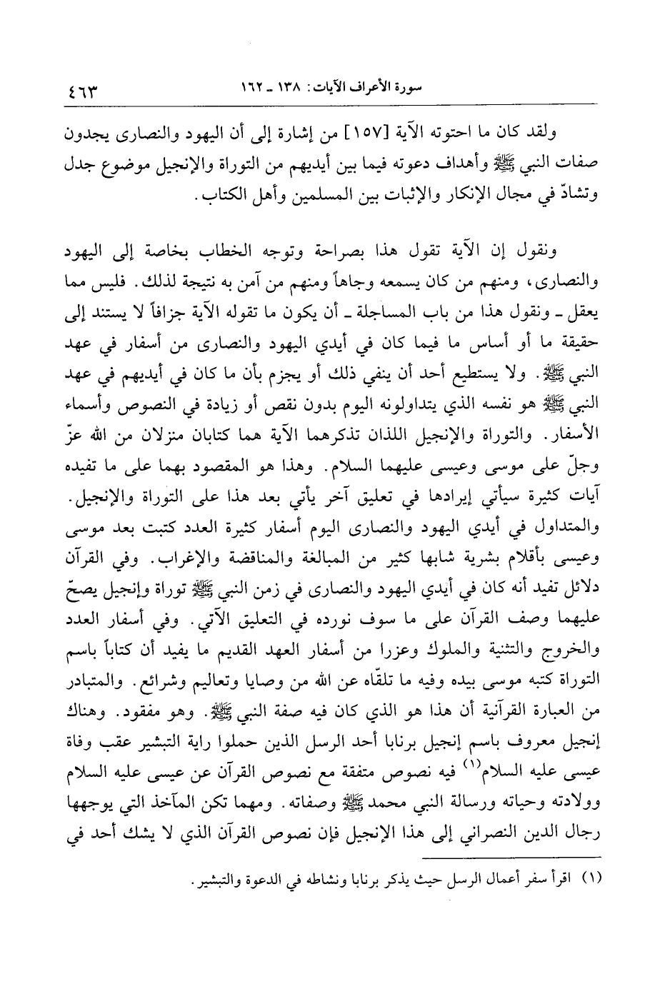 والمتداول في أيدي اليهود والنصارى اليوم أسفار كثيرة العدد كتبت بعد موسى وعيسى بأقلام بشرية شابها كثير من المبالغة والمناقضة والإغراب. وفي القرآن دلائل تفيد أنه كان في أيدي اليهود والنصارى في زمن النبي صلّى الله عليه وسلّم توراة وإنجيل يصحّ عليهما وصف القرآن على ما سوف نورده في التعليق الآتي. وفي أسفار العدد والخروج والتثنية والملوك وعزرا من أسفار العهد القديم ما يفيد أن كتابا باسم التوراة كتبه موسى بيده وفيه ما تلقّاه عن الله من وصايا وتعاليم وشرائع. والمتبادر من العبارة القرآنية أن هذا هو الذي كان فيه صفة النبي صلّى الله عليه وسلّم. وهو مفقود. وهناك إنجيل معروف باسم إنجيل برنابا أحد الرسل الذين حملوا راية التبشير عقب وفاة عيسى عليه السلام «1» فيه نصوص متفقة مع نصوص القرآن عن عيسى عليه السلام وولادته وحياته ورسالة النبي محمد صلّى الله عليه وسلّم وصفاته. ومهما تكن المآخذ التي يوجهها رجال الدين النصراني إلى هذا الإنجيل فإن نصوص القرآن الذي لا يشك أحد في