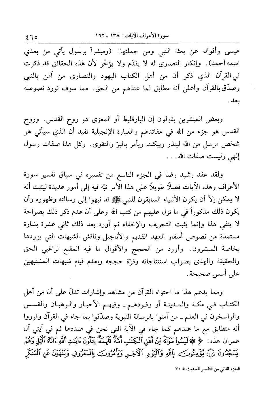 ولقد عقد رشيد رضا في الجزء التاسع من تفسيره في سياق تفسير سورة الأعراف وهذه الآيات فصلا طويلا على هذا الأمر نبّه فيه إلى أمور عديدة ليثبت أنه لا يمكن إلّا أن يكون الأنبياء السابقون للنبي صلّى الله عليه وسلّم قد نبهوا إلى رسالته وظهوره وأن يكون ذلك مذكورا في ما نزل عليهم من كتب الله وعلى أن عدم ذكر ذلك بصراحة لا ينفي هذا وإنما يثبت التحريف والإخفاء ثم أورد بعد ذلك ثاني عشرة بشارة مستمدة من نصوص أسفار العهد القديم والأناجيل وناقش الشبهات التي يوردها بخاصة المبشرون. وأورد من الحجج والأقوال ما فيه المقنع لراغبي الحق والحقيقة والهدى بصواب استنتاجاته وقوّة حججه وبعدم قيام شبهات المشتبهين على أسس صحيحة.