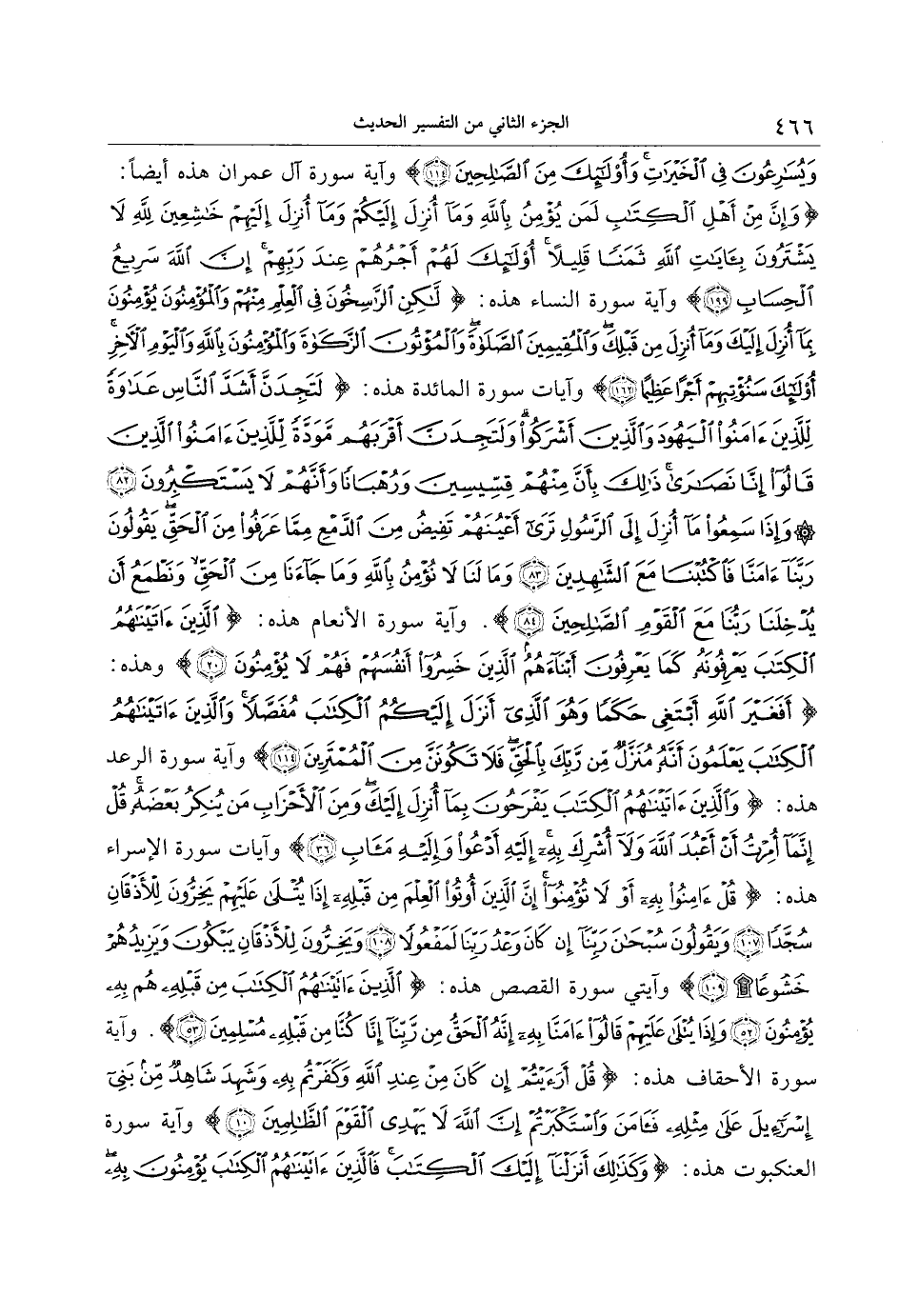 وَإِنَّ مِنْ أَهْلِ الْكِتابِ لَمَنْ يُؤْمِنُ بِاللَّهِ وَما أُنْزِلَ إِلَيْكُمْ وَما أُنْزِلَ إِلَيْهِمْ خاشِعِينَ لِلَّهِ لا يَشْتَرُونَ بِآياتِ اللَّهِ ثَمَناً قَلِيلًا أُولئِكَ لَهُمْ أَجْرُهُمْ عِنْدَ رَبِّهِمْ إِنَّ اللَّهَ سَرِيعُ الْحِسابِ (199) وآية سورة النساء هذه: لكِنِ الرَّاسِخُونَ فِي الْعِلْمِ مِنْهُمْ وَالْمُؤْمِنُونَ يُؤْمِنُونَ بِما أُنْزِلَ إِلَيْكَ وَما أُنْزِلَ مِنْ قَبْلِكَ وَالْمُقِيمِينَ الصَّلاةَ وَالْمُؤْتُونَ الزَّكاةَ وَالْمُؤْمِنُونَ بِاللَّهِ وَالْيَوْمِ الْآخِرِ أُولئِكَ سَنُؤْتِيهِمْ أَجْراً عَظِيماً (162) وآيات سورة المائدة هذه: لَتَجِدَنَّ أَشَدَّ النَّاسِ عَداوَةً لِلَّذِينَ آمَنُوا الْيَهُودَ وَالَّذِينَ أَشْرَكُوا وَلَتَجِدَنَّ أَقْرَبَهُمْ مَوَدَّةً لِلَّذِينَ آمَنُوا الَّذِينَ قالُوا إِنَّا نَصارى ذلِكَ بِأَنَّ مِنْهُمْ قِسِّيسِينَ وَرُهْباناً وَأَنَّهُمْ لا يَسْتَكْبِرُونَ (82) وَإِذا سَمِعُوا ما أُنْزِلَ إِلَى الرَّسُولِ تَرى أَعْيُنَهُمْ تَفِيضُ مِنَ الدَّمْعِ مِمَّا عَرَفُوا مِنَ الْحَقِّ يَقُولُونَ رَبَّنا آمَنَّا فَاكْتُبْنا مَعَ الشَّاهِدِينَ (83) وَما لَنا لا نُؤْمِنُ بِاللَّهِ وَما جاءَنا مِنَ الْحَقِّ وَنَطْمَعُ أَنْ يُدْخِلَنا رَبُّنا مَعَ الْقَوْمِ الصَّالِحِينَ (84) . وآية سورة الأنعام هذه: الَّذِينَ آتَيْناهُمُ الْكِتابَ يَعْرِفُونَهُ كَما يَعْرِفُونَ أَبْناءَهُمُ الَّذِينَ خَسِرُوا أَنْفُسَهُمْ فَهُمْ لا يُؤْمِنُونَ (20) وهذه:
