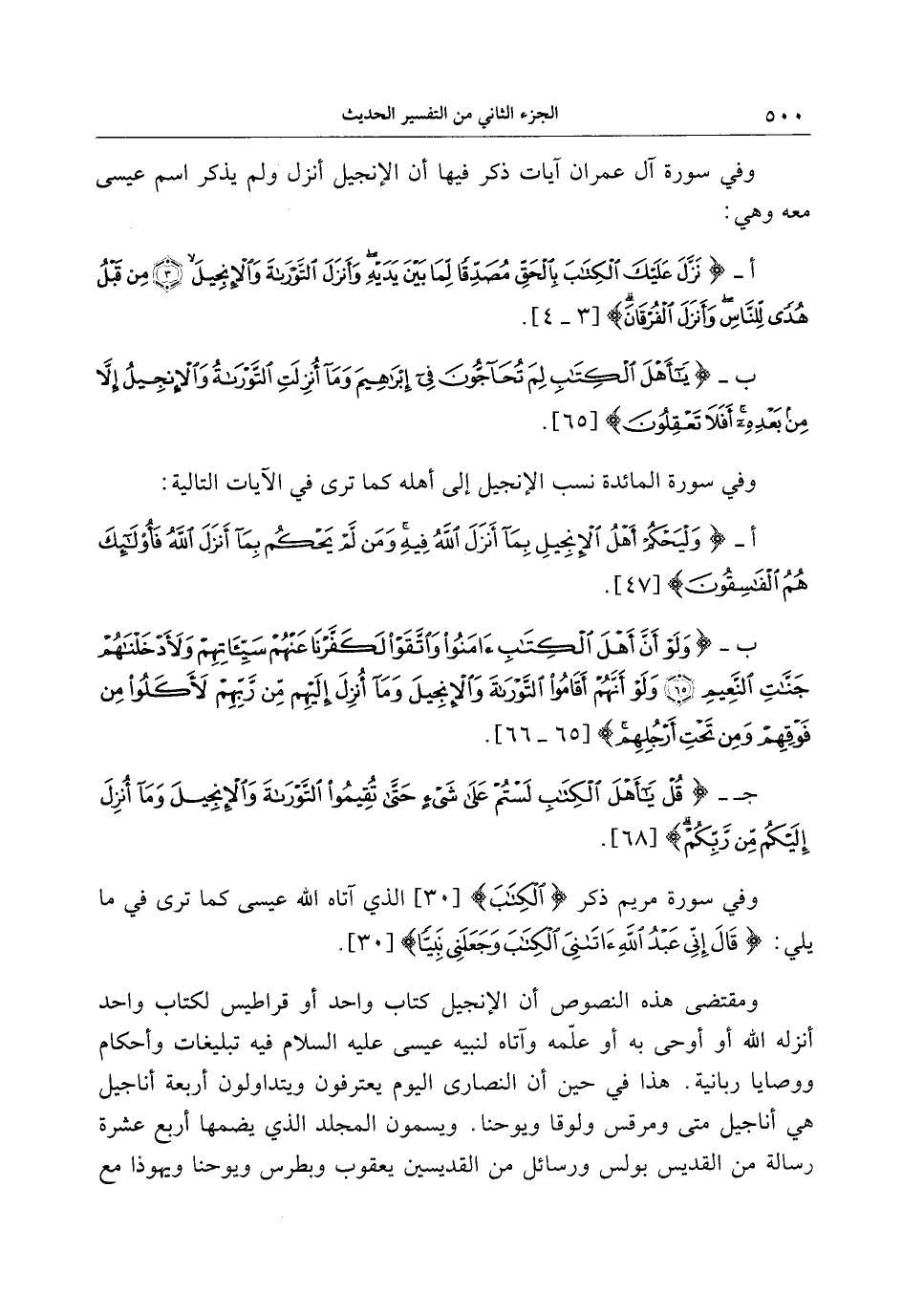 ومقتضى هذه النصوص أن الإنجيل كتاب واحد أو قراطيس لكتاب واحد أنزله الله أو أوحى به أو علّمه وآتاه لنبيه عيسى عليه السلام فيه تبليغات وأحكام ووصايا ربانية. هذا في حين أن النصارى اليوم يعترفون ويتداولون أربعة أناجيل هي أناجيل متى ومرقس ولوقا ويوحنا. ويسمون المجلد الذي يضمها أربع عشرة رسالة من القديس بولس ورسائل من القديسين يعقوب وبطرس ويوحنا ويهوذا مع