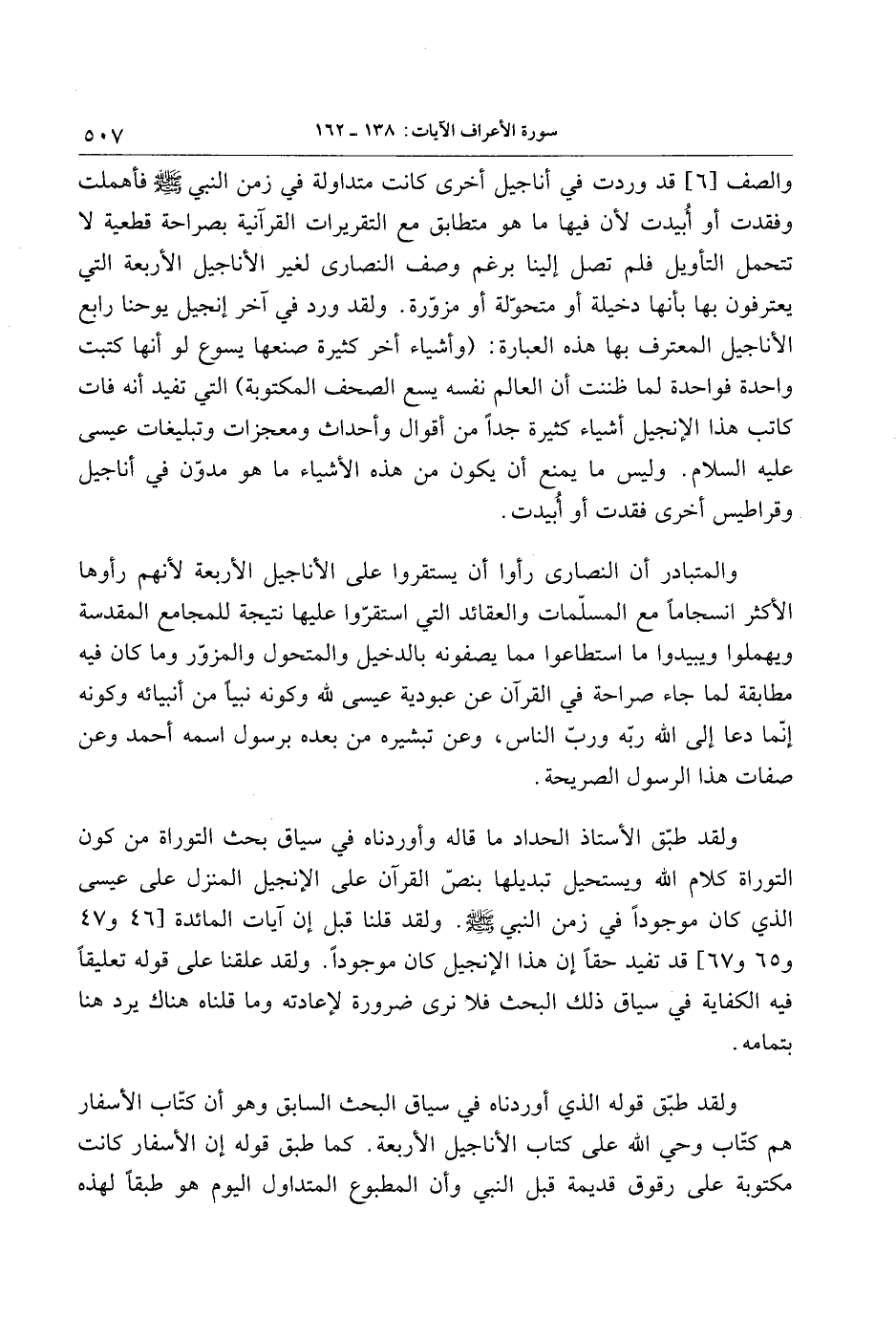 والصف [6] قد وردت في أناجيل أخرى كانت متداولة في زمن النبي صلّى الله عليه وسلّم فأهملت وفقدت أو أبيدت لأن فيها ما هو متطابق مع التقريرات القرآنية بصراحة قطعية لا تتحمل التأويل فلم تصل إلينا برغم وصف النصارى لغير الأناجيل الأربعة التي يعترفون بها بأنها دخيلة أو متحوّلة أو مزوّرة. ولقد ورد في آخر إنجيل يوحنا رابع الأناجيل المعترف بها هذه العبارة: (وأشياء أخر كثيرة صنعها يسوع لو أنها كتبت واحدة فواحدة لما ظننت أن العالم نفسه يسع الصحف المكتوبة) التي تفيد أنه فات كاتب هذا الإنجيل أشياء كثيرة جدا من أقوال وأحداث ومعجزات وتبليغات عيسى عليه السلام. وليس ما يمنع أن يكون من هذه الأشياء ما هو مدوّن في أناجيل وقراطيس أخرى فقدت أو أبيدت.