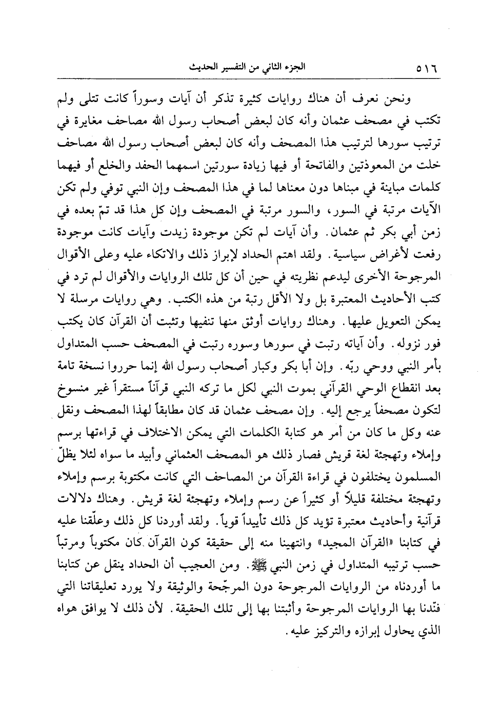 ونحن نعرف أن هناك روايات كثيرة تذكر أن آيات وسورا كانت تتلى ولم تكتب في مصحف عثمان وأنه كان لبعض أصحاب رسول الله مصاحف مغايرة في ترتيب سورها لترتيب هذا المصحف وأنه كان لبعض أصحاب رسول الله مصاحف خلت من المعوذتين والفاتحة أو فيها زيادة سورتين اسمهما الحفد والخلع أو فيهما كلمات مباينة في مبناها دون معناها لما في هذا المصحف وإن النبي توفي ولم تكن الآيات مرتبة في السور، والسور مرتبة في المصحف وإن كل هذا قد تمّ بعده في زمن أبي بكر ثم عثمان. وأن آيات لم تكن موجودة زيدت وآيات كانت موجودة رفعت لأغراض سياسية. ولقد اهتم الحداد لإبراز ذلك والاتكاء عليه وعلى الأقوال المرجوحة الأخرى ليدعم نظريته في حين أن كل تلك الروايات والأقوال لم ترد في كتب الأحاديث المعتبرة بل ولا الأقل رتبة من هذه الكتب. وهي روايات مرسلة لا يمكن التعويل عليها. وهناك روايات أوثق منها تنفيها وتثبت أن القرآن كان يكتب فور نزوله. وأن آياته رتبت في سورها وسوره رتبت في المصحف حسب المتداول بأمر النبي ووحي ربّه. وإن أبا بكر وكبار أصحاب رسول الله إنما حرروا نسخة تامة بعد انقطاع الوحي القرآني بموت النبي لكل ما تركه النبي قرآنا مستقرا غير منسوخ لتكون مصحفا يرجع إليه. وإن مصحف عثمان قد كان مطابقا لهذا المصحف ونقل عنه وكل ما كان من أمر هو كتابة الكلمات التي يمكن الاختلاف في قراءتها برسم وإملاء وتهجئة لغة قريش فصار ذلك هو المصحف العثماني وأبيد ما سواه لئلا يظلّ المسلمون يختلفون في قراءة القرآن من المصاحف التي كانت مكتوبة برسم وإملاء وتهجئة مختلفة قليلا أو كثيرا عن رسم وإملاء وتهجئة لغة قريش. وهناك دلالات قرآنية وأحاديث معتبرة تؤيد كل ذلك تأييدا قويا. ولقد أوردنا كل ذلك وعلّقنا عليه في كتابنا «القرآن المجيد» وانتهينا منه إلى حقيقة كون القرآن كان مكتوبا ومرتبا حسب ترتيبه المتداول في زمن النبي صلّى الله عليه وسلّم. ومن العجيب أن الحداد ينقل عن كتابنا ما أوردناه من الروايات المرجوحة دون المرجّحة والوثيقة ولا يورد تعليقاتنا التي فنّدنا بها الروايات المرجوحة وأثبتنا بها إلى تلك الحقيقة. لأن ذلك لا يوافق هواه الذي يحاول إبرازه والتركيز عليه.