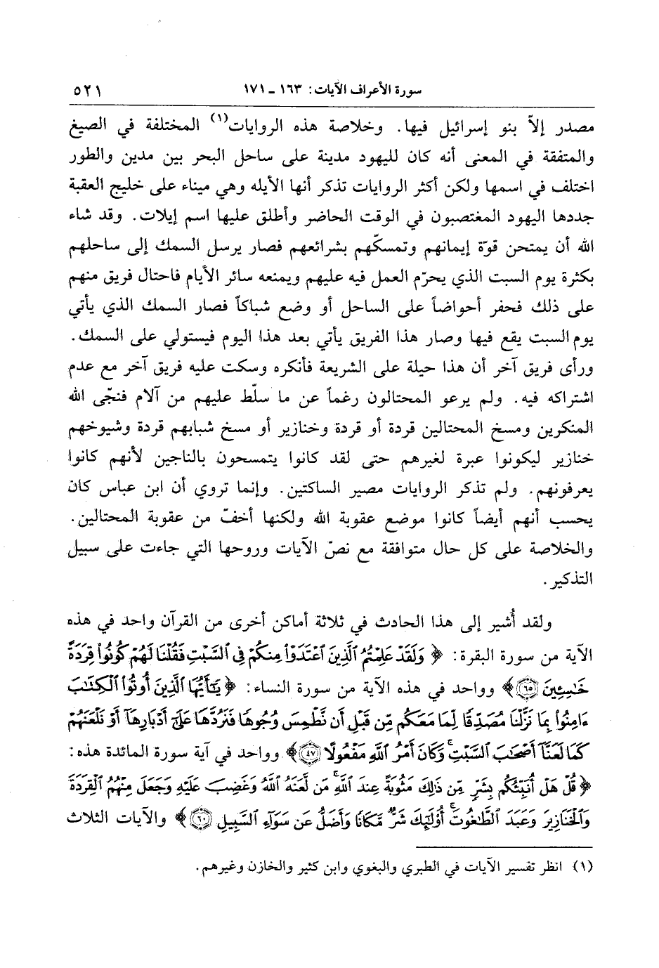 مصدر إلّا بنو إسرائيل فيها. وخلاصة هذه الروايات «1» المختلفة في الصيغ والمتفقة في المعنى أنه كان لليهود مدنية على ساحل البحر بين مدين والطور اختلف في اسمها ولكن أكثر الروايات تذكر أنها الأيلة وهي ميناء على خليج العقبة جددها اليهود المغتصبون في الوقت الحاضر وأطلق عليها اسم إيلات. وقد شاء الله أن يمتحن قوّة إيمانهم وتمسّكهم بشرائعهم فصار يرسل السمك إلى ساحلهم بكثرة يوم السبت الذي يحرّم العمل فيه عليهم ويمنعه سائر الأيام فاحتال فريق منهم على ذلك فحفر أحواضا على الساحل أو وضع شباكا فصار السمك الذي يأتي يوم السبت يقع فيها وصار هذا الفريق يأتي بعد هذا اليوم فيستولي على السمك.