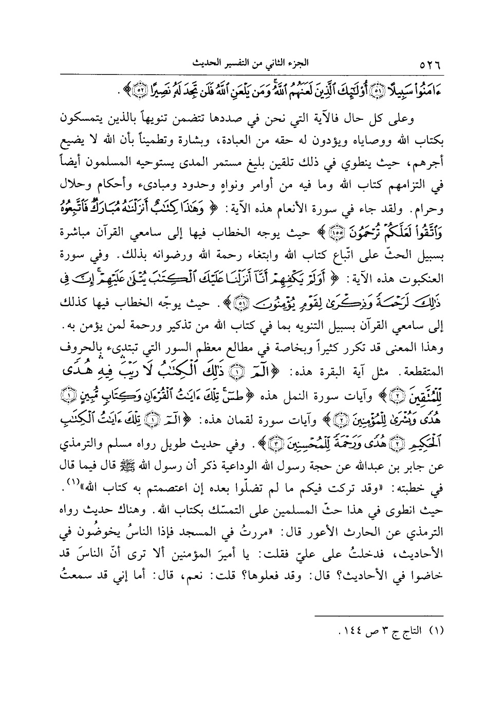 وهذا المعنى قد تكرر كثيرا وبخاصة في مطالع معظم السور التي تبتدئ بالحروف المتقطعة. مثل آية البقرة هذه: الم (1) ذلِكَ الْكِتابُ لا رَيْبَ فِيهِ هُدىً لِلْمُتَّقِينَ (2) وآيات سورة النمل هذه طس تِلْكَ آياتُ الْقُرْآنِ وَكِتابٍ مُبِينٍ (1) هُدىً وَبُشْرى لِلْمُؤْمِنِينَ (2) وآيات سورة لقمان هذه: الم (1) تِلْكَ آياتُ الْكِتابِ الْحَكِيمِ (2) هُدىً وَرَحْمَةً لِلْمُحْسِنِينَ (3) . وفي حديث طويل رواه مسلم والترمذي عن جابر بن عبد الله عن حجة رسول الله الوداعية ذكر أن رسول الله صلّى الله عليه وسلّم قال فيما قال في خطبته: «وقد تركت فيكم ما لم تضلّوا بعده إن اعتصمتم به كتاب الله» «1» .