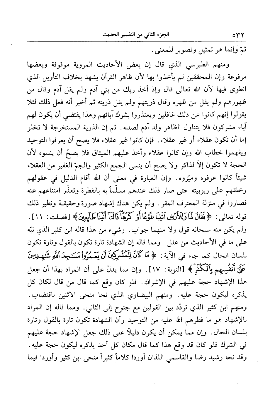 ولم يكن منه سبحانه قول ولا منهما جواب. وشيء من هذا قاله ابن كثير الذي نبّه على ما في الأحاديث من علل. ومما قاله إن الشهادة تارة تكون بالقول وتارة تكون بلسان الحال كما جاء في الآية: ما كانَ لِلْمُشْرِكِينَ أَنْ يَعْمُرُوا مَساجِدَ اللَّهِ شاهِدِينَ عَلى أَنْفُسِهِمْ بِالْكُفْرِ [التوبة: 17] . وإن مما يدلّ على أن المراد بهذا أن جعل هذا الإشهاد حجة عليهم في الإشراك. فلو كان وقع كما قال من قال لكان كل يذكره ليكون حجة عليه. ومنهم البيضاوي الذي نحا منحى الاثنين باقتضاب.