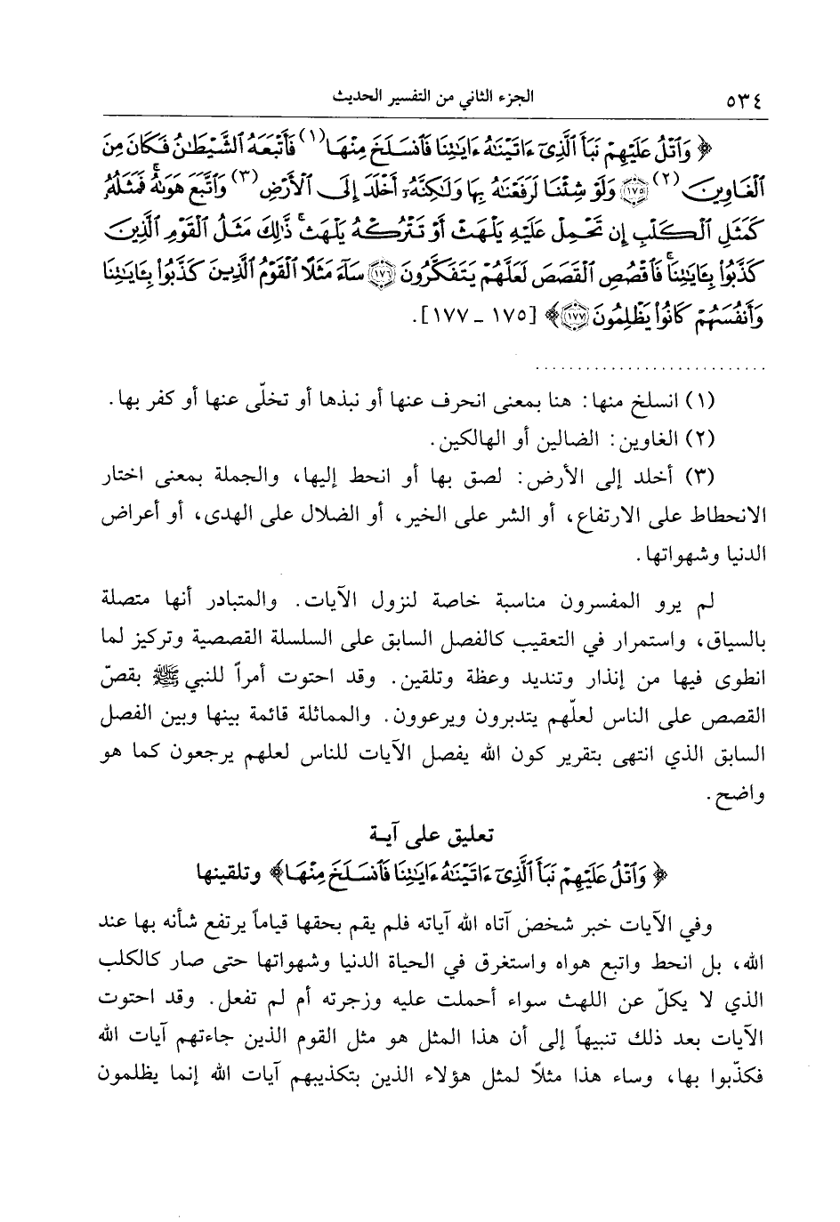 وَاتْلُ عَلَيْهِمْ نَبَأَ الَّذِي آتَيْناهُ آياتِنا فَانْسَلَخَ مِنْها فَأَتْبَعَهُ الشَّيْطانُ فَكانَ مِنَ الْغاوِينَ (175) وَلَوْ شِئْنا لَرَفَعْناهُ بِها وَلكِنَّهُ أَخْلَدَ إِلَى الْأَرْضِ وَاتَّبَعَ هَواهُ فَمَثَلُهُ كَمَثَلِ الْكَلْبِ إِنْ تَحْمِلْ عَلَيْهِ يَلْهَثْ أَوْ تَتْرُكْهُ يَلْهَثْ ذلِكَ مَثَلُ الْقَوْمِ الَّذِينَ كَذَّبُوا بِآياتِنا فَاقْصُصِ الْقَصَصَ لَعَلَّهُمْ يَتَفَكَّرُونَ (176) ساءَ مَثَلاً الْقَوْمُ الَّذِينَ كَذَّبُوا بِآياتِنا وَأَنْفُسَهُمْ كانُوا يَظْلِمُونَ (177)