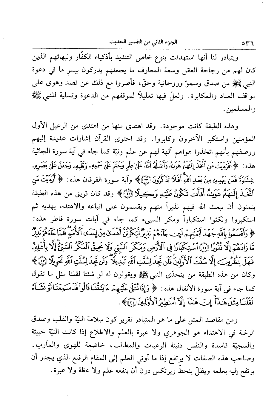 وهذه الطبقة كانت موجودة. وقد اهتدى منها من اهتدى من الرعيل الأول المؤمنين واستكبر الآخرون وكابروا. وقد احتوى القرآن إشارات عديدة إليهم ووصفهم بأنهم اتخذوا هواهم آلهة لهم عن علم ونيّة كما جاء في آية سورة الجاثية هذه: أَفَرَأَيْتَ مَنِ اتَّخَذَ إِلهَهُ هَواهُ وَأَضَلَّهُ اللَّهُ عَلى عِلْمٍ وَخَتَمَ عَلى سَمْعِهِ وَقَلْبِهِ وَجَعَلَ عَلى بَصَرِهِ غِشاوَةً فَمَنْ يَهْدِيهِ مِنْ بَعْدِ اللَّهِ أَفَلا تَذَكَّرُونَ (23) وآية سورة الفرقان هذه: أَرَأَيْتَ مَنِ اتَّخَذَ إِلهَهُ هَواهُ أَفَأَنْتَ تَكُونُ عَلَيْهِ وَكِيلًا (43) وقد كان فريق من هذه الطبقة يتمنون أن يبعث الله فيهم نذيرا منهم ويقسمون على اتباعه والاهتداء بهديه ثم استكبروا ونكثوا استكبارا ومكر السيئ كما جاء في آيات سورة فاطر هذه: