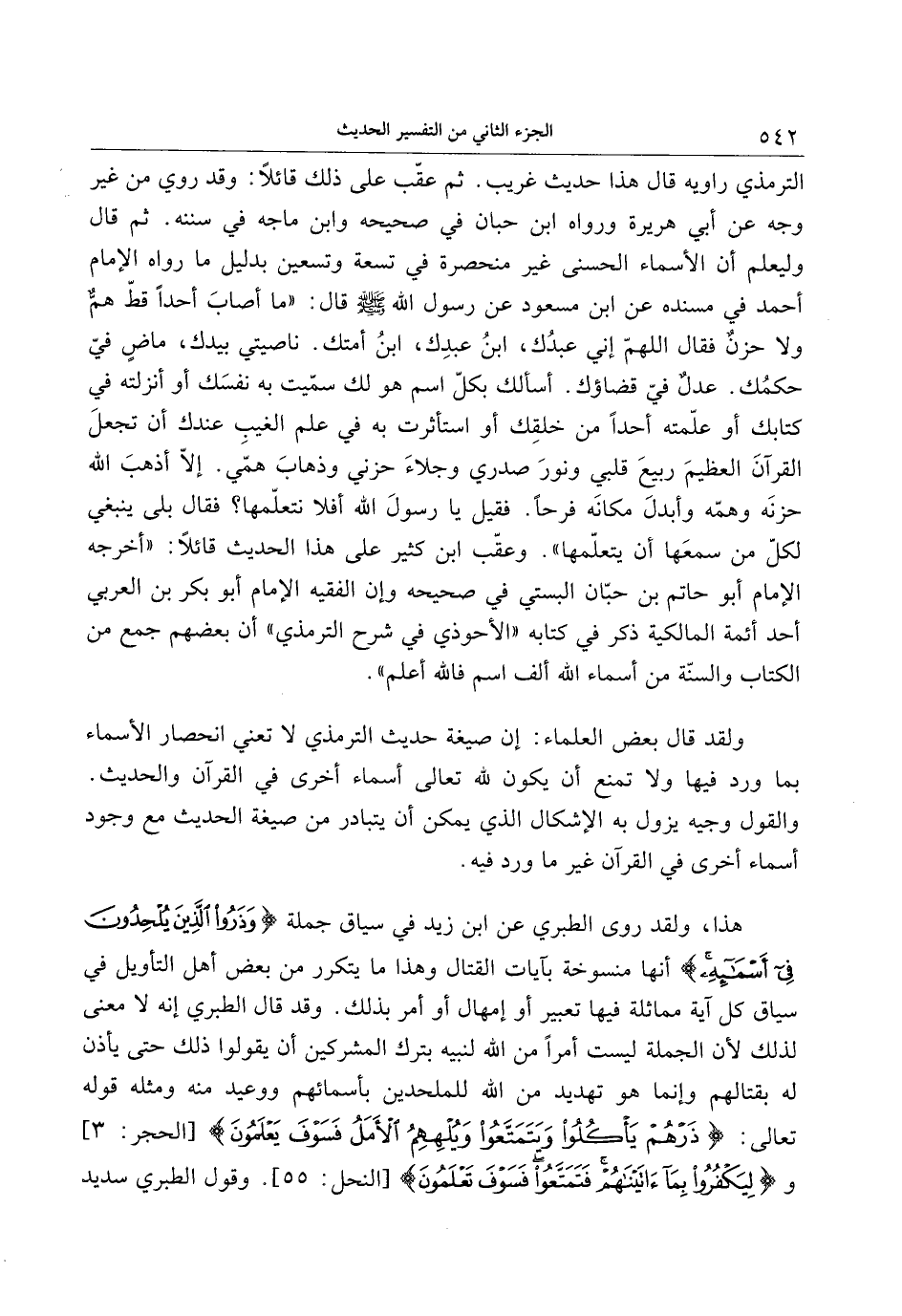 الترمذي رواية قال هذا حديث غريب. ثم عقّب على ذلك قائلا: وقد روي من غير وجه عن أبي هريرة ورواه ابن حبان في صحيحه وابن ماجه في سننه. ثم قال وليعلم أن الأسماء الحسنى غير منحصرة في تسعة وتسعين بدليل ما رواه الإمام أحمد في مسنده عن ابن مسعود عن رسول الله صلّى الله عليه وسلّم قال: «ما أصاب أحدا قطّ همّ ولا حزن فقال اللهمّ إني عبدك، ابن عبدك، ابن أمتك. ناصيتي بيدك، ماض فيّ حكمك. عدل فيّ قضاؤك. أسألك بكلّ اسم هو لك سمّيت به نفسك أو أنزلته في كتابك أو علّمته أحدا من خلقك أو استأثرت به في علم الغيب عندك أن تجعل القرآن العظيم ربيع قلبي ونور صدري وجلاء حزني وذهاب همّي. إلّا أذهب الله حزنه وهمّه وأبدل مكانه فرحا. فقيل يا رسول الله أفلا نتعلّمها؟ فقال بلى ينبغي لكلّ من سمعها أن يتعلّمها» . وعقّب ابن كثير على هذا الحديث قائلا: «أخرجه الإمام أبو حاتم بن حبّان البستي في صحيحه وإن الفقيه الإمام أبو بكر بن العربي أحد أئمة المالكية ذكر في كتابه «الأحوذي في شرح الترمذي» أن بعضهم جمع من الكتاب والسنّة من أسماء الله ألف اسم فالله أعلم» .