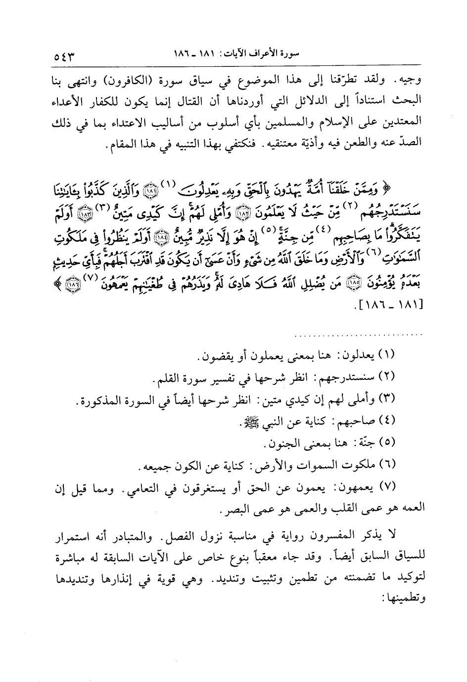وَمِمَّنْ خَلَقْنا أُمَّةٌ يَهْدُونَ بِالْحَقِّ وَبِهِ يَعْدِلُونَ (181) وَالَّذِينَ كَذَّبُوا بِآياتِنا سَنَسْتَدْرِجُهُمْ مِنْ حَيْثُ لا يَعْلَمُونَ (182) وَأُمْلِي لَهُمْ إِنَّ كَيْدِي مَتِينٌ (183) أَوَلَمْ يَتَفَكَّرُوا ما بِصاحِبِهِمْ مِنْ جِنَّةٍ إِنْ هُوَ إِلاَّ نَذِيرٌ مُبِينٌ (184) أَوَلَمْ يَنْظُرُوا فِي مَلَكُوتِ السَّماواتِ وَالْأَرْضِ وَما خَلَقَ اللَّهُ مِنْ شَيْءٍ وَأَنْ عَسى أَنْ يَكُونَ قَدِ اقْتَرَبَ أَجَلُهُمْ فَبِأَيِّ حَدِيثٍ بَعْدَهُ يُؤْمِنُونَ (185)