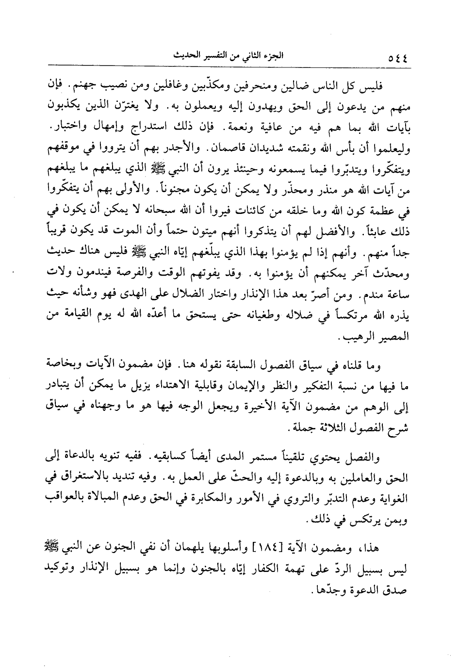 هذا، ومضمون الآية [184] وأسلوبها يلهمان أن نفي الجنون عن النبي صلّى الله عليه وسلّم ليس بسبيل الردّ على تهمة الكفار إيّاه بالجنون وإنما هو بسبيل الإنذار وتوكيد صدق الدعوة وجدّها.