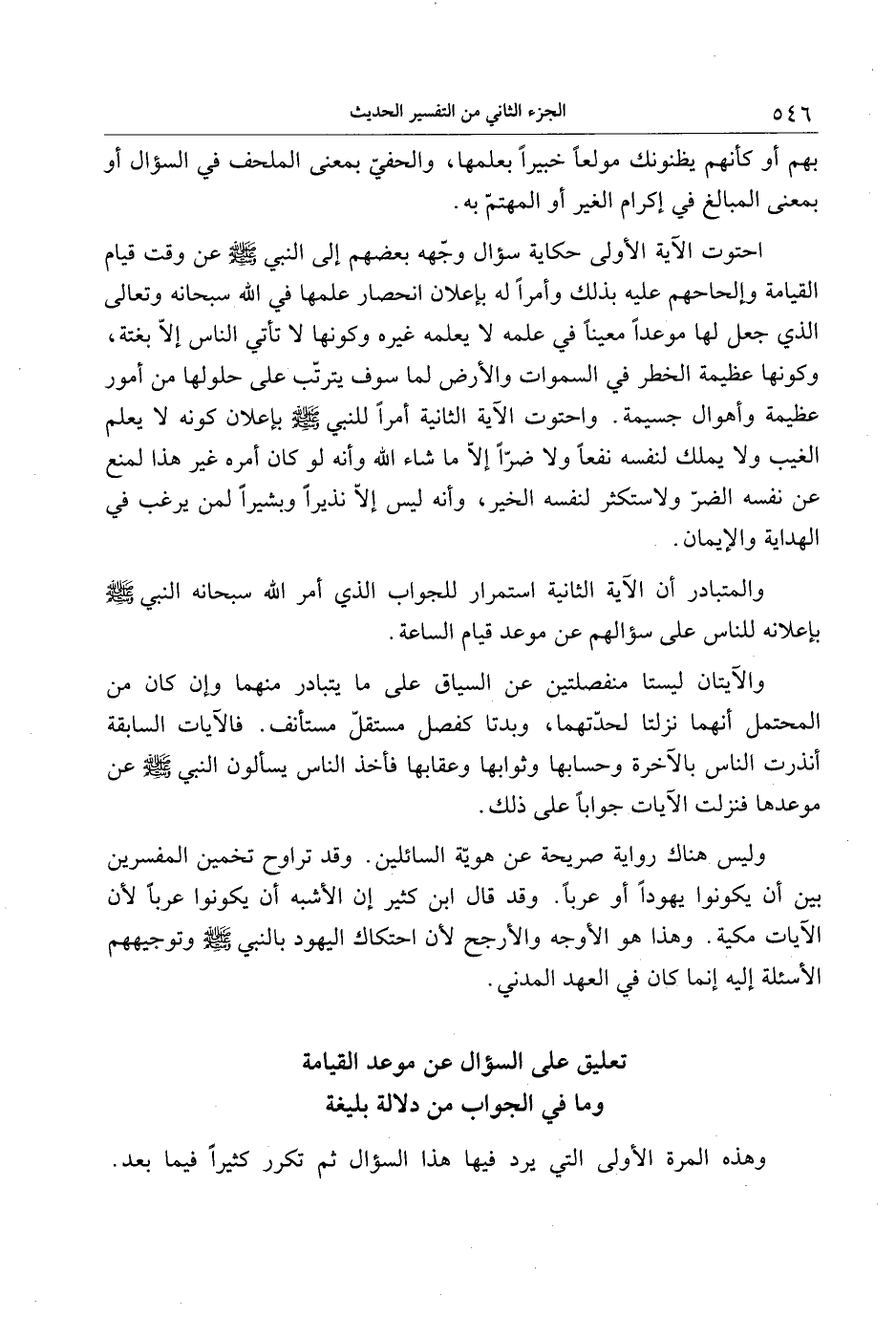 والمتبادر أن الآية الثانية استمرار للجواب الذي أمر الله سبحانه النبي صلّى الله عليه وسلّم بإعلانه للناس على سؤالهم عن موعد قيام الساعة.