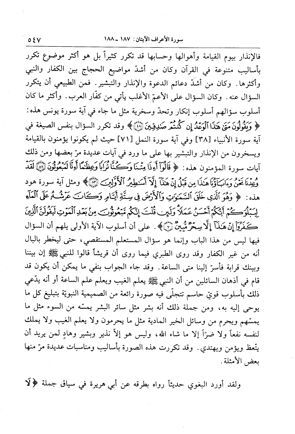 وَيَقُولُونَ مَتى هذَا الْوَعْدُ إِنْ كُنْتُمْ صادِقِينَ (48) وقد تكرر السؤال بنفس الصيغة في آية سورة الأنبياء [38] وفي آية سورة النمل [71] حيث لم يكونوا يؤمنون بالقيامة ويسخرون من الإنذار والتبشير بها على ما ورد في آيات عديدة مرّ بعضها ومن ذلك آيات سورة المؤمنون هذه: قالُوا أَإِذا مِتْنا وَكُنَّا تُراباً وَعِظاماً أَإِنَّا لَمَبْعُوثُونَ (82) لَقَدْ وُعِدْنا نَحْنُ وَآباؤُنا هذا مِنْ قَبْلُ إِنْ هذا إِلَّا أَساطِيرُ الْأَوَّلِينَ (83) ومثل آية سورة هود هذه: وَهُوَ الَّذِي خَلَقَ السَّماواتِ وَالْأَرْضَ فِي سِتَّةِ أَيَّامٍ وَكانَ عَرْشُهُ عَلَى الْماءِ لِيَبْلُوَكُمْ أَيُّكُمْ أَحْسَنُ عَمَلًا وَلَئِنْ قُلْتَ إِنَّكُمْ مَبْعُوثُونَ مِنْ بَعْدِ الْمَوْتِ لَيَقُولَنَّ الَّذِينَ كَفَرُوا إِنْ هذا إِلَّا سِحْرٌ مُبِينٌ (7) . على أن أسلوب الآية الأولى يلهم أن السؤال فيها ليس من هذا الباب وإنما هو سؤال المستعلم المستقصي، حتى ليخطر بالبال أنه من غير الكفار وقد روى الطبري فيما روى أن قريشا قالوا للنبي صلّى الله عليه وسلّم إن بيننا وبينك قرابة فأسرّ إلينا متى الساعة. وقد جاء الجواب بنفي ما يمكن أن يكون قد قام في أذهان السائلين من أن النبي صلّى الله عليه وسلّم يعلم الغيب ويعلم علم الساعة أو أنه يدّعي ذلك بأسلوب قويّ حاسم تتجلّي فيه صورة رائعة من الصميمية النبويّة بتبليغ كل ما يوحى إليه به، ومن جملة ذلك أنه بشر مثل سائر البشر يمسّه من السوء مثل ما يمسّهم ويحرم من وسائل الخير المادية مثل ما يحرمون ولا يعلم الغيب ولا يملك لنفسه نفعا ولا ضرّا إلا ما شاء الله، وليس هو إلّا نذير وبشير وهاد لمن يريد أن يتّعظ ويؤمن ويهتدي. وقد تكررت هذه الصورة بأساليب ومناسبات عديدة مرّ منها بعض الأمثلة.