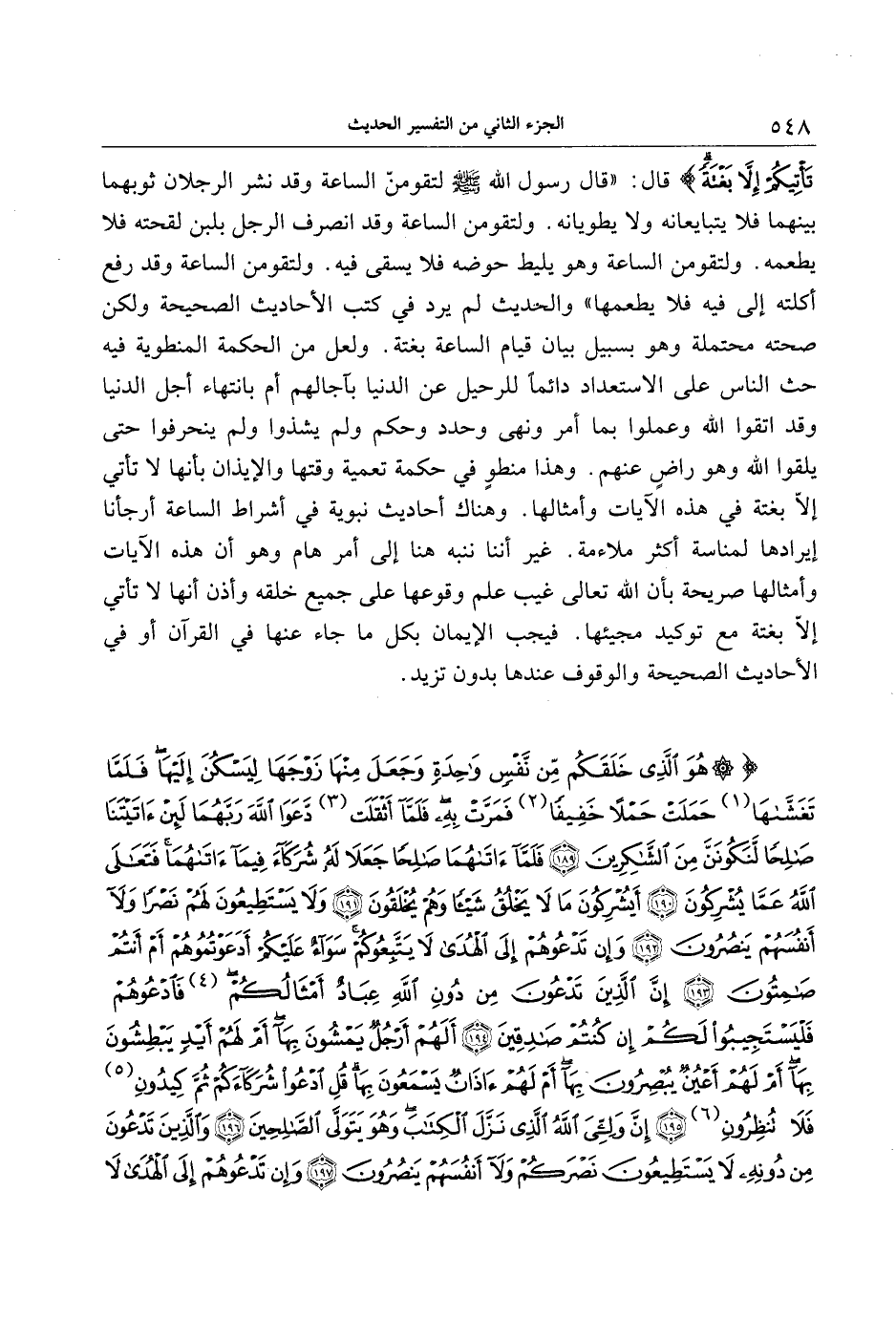 قال: «قال رسول الله صلّى الله عليه وسلّم لتقومنّ الساعة وقد نشر الرجلان ثوبهما بينهما فلا يتبايعانه ولا يطويانه. ولتقومن الساعة وقد انصرف الرجل بلبن لقحته فلا يطعمه. ولتقومن الساعة وهو يليط حوضه فلا يسقى فيه. ولتقومن الساعة وقد رفع أكلته إلى فيه فلا يطعمها» والحديث لم يرد في كتب الأحاديث الصحيحة ولكن صحته محتملة وهو بسبيل بيان قيام الساعة بغتة. ولعل من الحكمة المنطوية فيه حث الناس على الاستعداد دائما للرحيل عن الدنيا بآجالهم أم بانتهاء أجل الدنيا وقد اتقوا الله وعملوا بما أمر ونهى وحدد وحكم ولم يشذوا ولم ينحرفوا حتى يلقوا الله وهو راض عنهم. وهذا منطو في حكمة تعمية وقتها والإيذان بأنها لا تأتي إلّا بغتة في هذه الآيات وأمثالها. وهناك أحاديث نبوية في أشراط الساعة أرجأنا إيرادها لمناسبة أكثر ملاءمة. غير أننا ننبه هنا إلى أمر هام وهو أن هذه الآيات وأمثالها صريحة بأن الله تعالى غيب علم وقوعها على جميع خلقه وأذن أنها لا تأتي إلّا بغتة مع توكيد مجيئها. فيجب الإيمان بكل ما جاء عنها في القرآن أو في الأحاديث الصحيحة والوقوف عندها بدون تزيد.