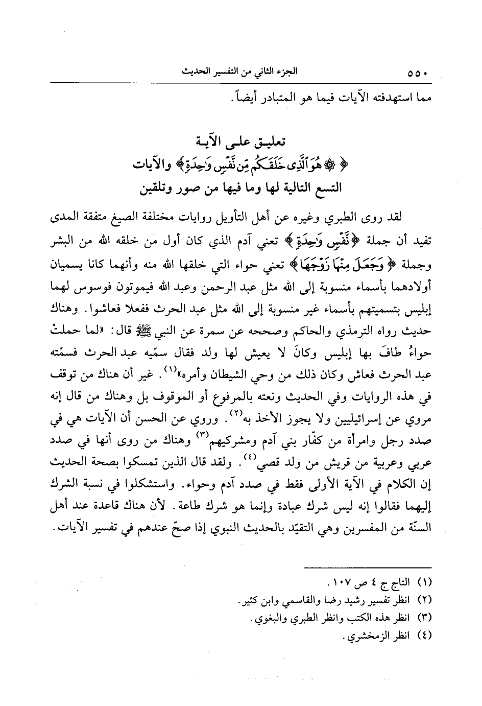 لقد روى الطبري وغيره عن أهل التأويل روايات مختلفة الصيغ متفقة المدى تفيد أن جملة نَفْسٍ واحِدَةٍ تعني آدم الذي كان أول من خلقه الله من البشر وجملة وَجَعَلَ مِنْها زَوْجَها تعني حواء التي خلقها الله منه وأنهما كان يسميان أولادهما بأسماء منسوبة إلى الله مثل عبد الرحمن وعبد الله فيموتون فوسوس لهما إبليس بتسميتهم بأسماء غير منسوبة إلى الله مثل عبد الحرث ففعلا فعاشوا. وهناك حديث رواه الترمذي والحاكم وصححه عن سمرة عن النبي صلّى الله عليه وسلّم قال: «لما حملت حواء طاف بها إبليس وكان لا يعيش لها ولد فقال سمّيه عبد الحرث فسمّته عبد الحرث فعاش وكان ذلك من وحي الشيطان وأمره» «1» . غير أن هناك من توقف في هذه الروايات وفي الحديث ونعته بالمرفوع أو الموقوف بل وهناك من قال إنه مروي عن إسرائيليين ولا يجوز الأخذ به «2» . وروي عن الحسن أن الآيات هي في صدد رجل وامرأة من كفّار بني آدم ومشركيهم «3» وهناك من روى أنها في صدد عربي وعربية من قريش من ولد قصي «4» . ولقد قال الذين تمسكوا بصحة الحديث إن الكلام في الآية الأولى فقط في صدد آدم وحواء. واستشكلوا في نسبة الشرك إليهما فقالوا إنه ليس شرك عبادة وإنما هو شرك طاعة. لأن هناك قاعدة عند أهل السنّة من المفسرين وهي التقيّد بالحديث النبوي إذا صحّ عندهم في تفسير الآيات.