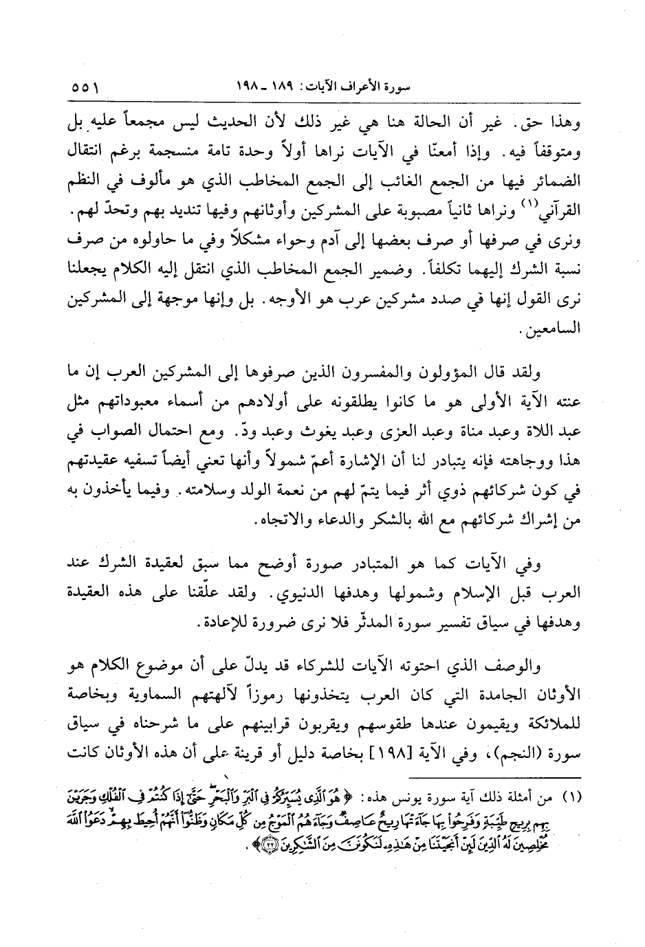 ونرى في صرفها أو صرف بعضها إلى آدم وحواء مشكلا وفي ما حاولوه من صرف نسبة الشرك إليهما تكلفا. وضمير الجمع المخاطب الذي انتقل إليه الكلام يجعلنا نرى القول إنها في صدد مشركين عرب هو الأوجه. بل وإنها موجهة إلى المشركين السامعين.