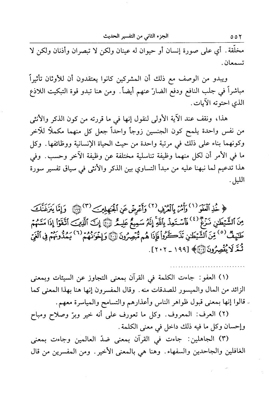 . (1) العفو: جاءت الكلمة في القرآن بمعنى التجاوز عن السيئات وبمعنى الزائد من المال والميسور للصدقات منه. وقال المفسرون إنها هنا بهذا المعنى كما قالوا إنها بمعنى قبول ظواهر الناس وأعذارهم والتسامح والمياسرة معهم.