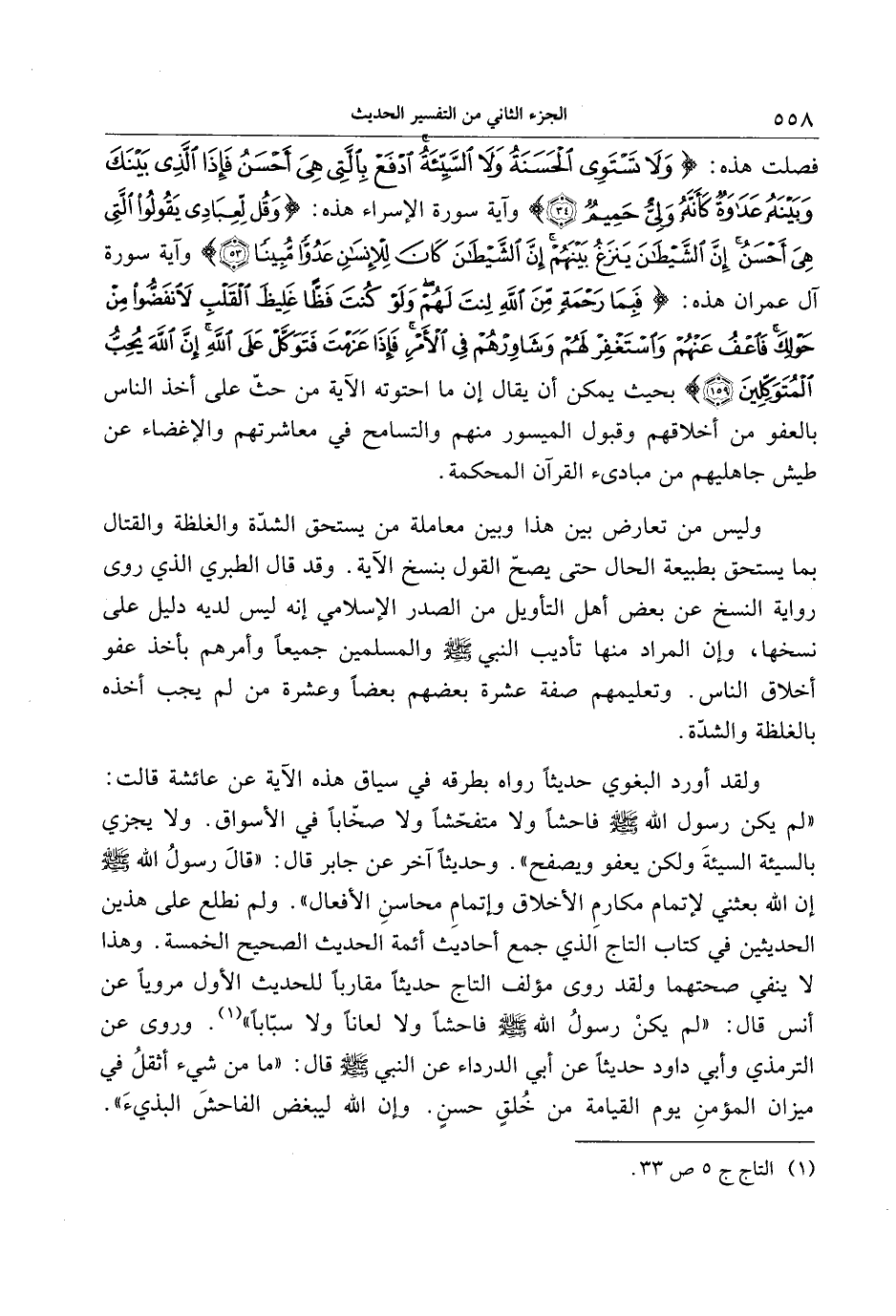 «لم يكن رسول الله صلّى الله عليه وسلّم فاحشا ولا متفحّشا ولا صخّابا في الأسواق. ولا يجزي بالسيئة السيئة ولكن يعفو ويصفح» . وحديثا آخر عن جابر قال: «قال رسول الله صلّى الله عليه وسلّم إن الله بعثني لإتمام مكارم الأخلاق وإتمام محاسن الأفعال» . ولم نطلع على هذين الحديثين في كتاب التاج الذي جمع أحاديث أئمة الحديث الصحيح الخمسة. وهذا لا ينفي صحتهما ولقد روى مؤلف التاج حديثا مقاربا للحديث الأول مرويا عن أنس قال: «لم يكن رسول الله صلّى الله عليه وسلّم فاحشا ولا لعانا ولا سبّابا» «1» . وروى عن الترمذي وأبي داود حديثا عن أبي الدرداء عن النبي صلّى الله عليه وسلّم قال: «ما من شيء أثقل في ميزان المؤمن يوم القيامة من خلق حسن. وإن الله ليبغض الفاحش البذيء» .