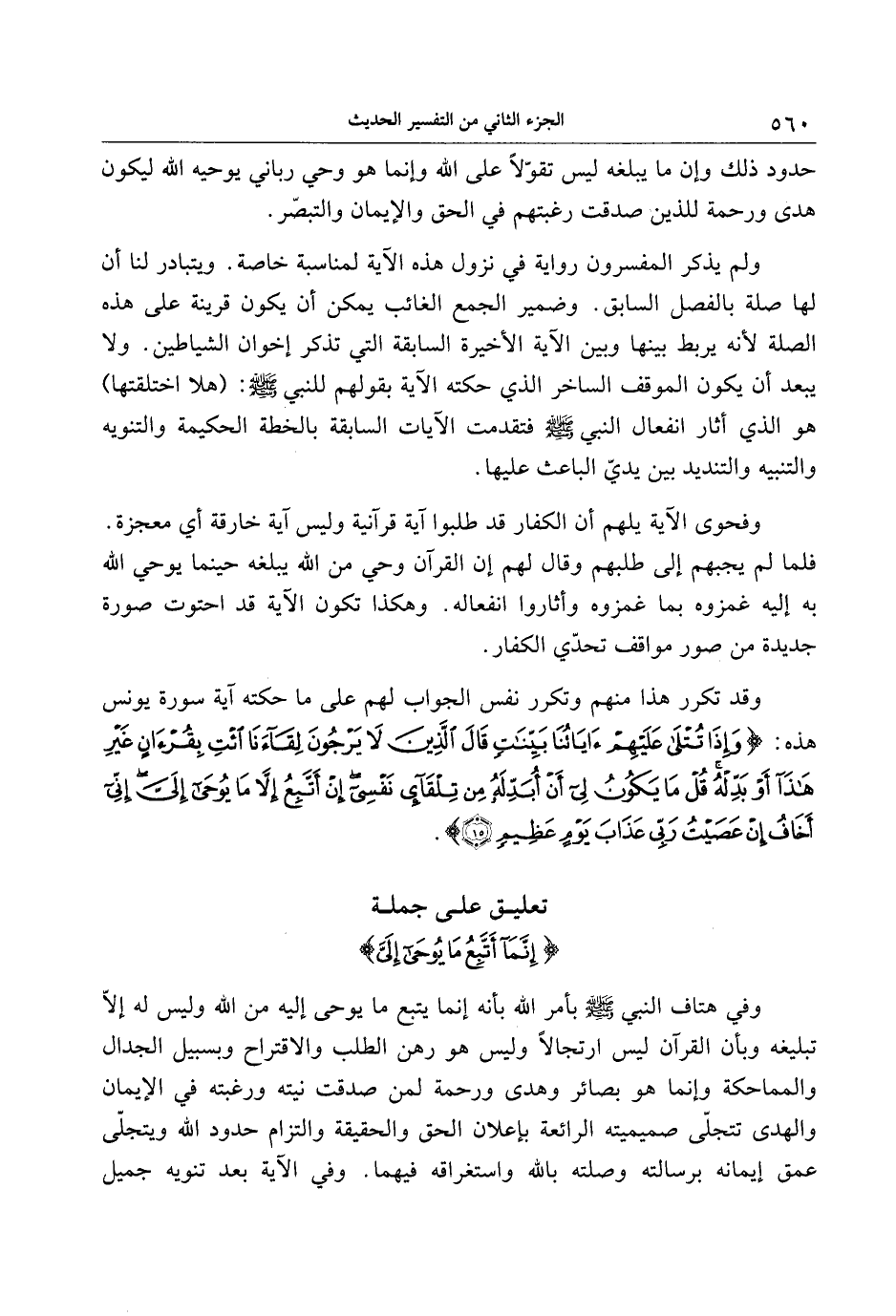 وفي هتاف النبي صلّى الله عليه وسلّم بأمر الله بأنه إنما يتبع ما يوحى إليه من الله وليس له إلّا تبليغه وبأن القرآن ليس ارتجالا وليس هو رهن الطلب والاقتراح وبسبيل الجدال والمماحكة وإنما هو بصائر وهدى ورحمة لمن صدقت نيته ورغبته في الإيمان والهدى تتجلّى صميميته الرائعة بإعلان الحق والحقيقة والتزام حدود الله ويتجلّى عمق إيمانه برسالته وصلته بالله واستغراقه فيهما. وفي الآية بعد تنويه جميل