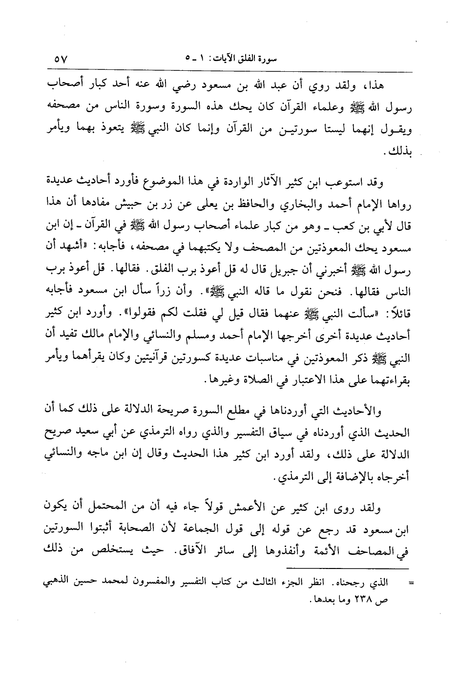 وقد استوعب ابن كثير الآثار الواردة في هذا الموضوع فأورد أحاديث عديدة رواها الإمام أحمد والبخاري والحافظ بن يعلى عن زر بن حبيش مفادها أن هذا قال لأبي بن كعب- وهو من كبار علماء أصحاب رسول الله صلّى الله عليه وسلّم في القرآن- إن ابن مسعود يحك المعوذتين من المصحف ولا يكتبهما في مصحفه، فأجابه: «أشهد أن رسول الله صلّى الله عليه وسلّم أخبرني أن جبريل قال له قل أعوذ برب الفلق. فقالها. قل أعوذ برب الناس فقالها. فنحن نقول ما قاله النبي صلّى الله عليه وسلّم» . وأن زرا سأل ابن مسعود فأجابه قائلا: «سألت النبي صلّى الله عليه وسلّم عنهما فقال قيل لي فقلت لكم فقولوا» . وأورد ابن كثير أحاديث عديدة أخرى أخرجها الإمام أحمد ومسلم والنسائي والإمام مالك تفيد أن النبي صلّى الله عليه وسلّم ذكر المعوذتين في مناسبات عديدة كسورتين قرآنيتين وكان يقرأهما ويأمر بقراءتهما على هذا الاعتبار في الصلاة وغيرها.