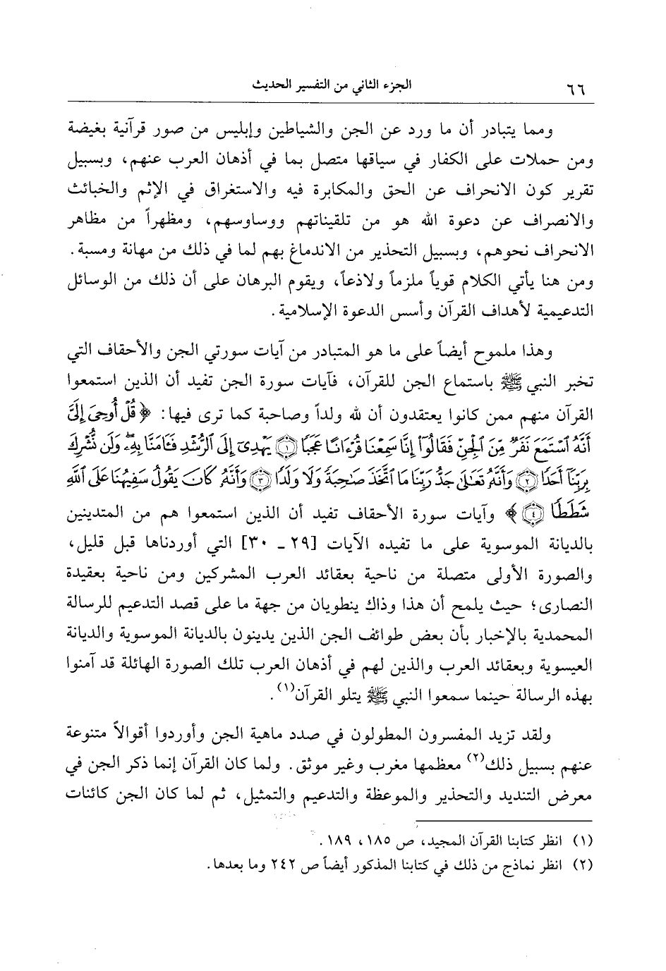 وهذا ملموح أيضا على ما هو المتبادر من آيات سورتي الجن والأحقاف التي تخبر النبي صلّى الله عليه وسلّم باستماع الجن للقرآن، فآيات سورة الجن تفيد أن الذين استمعوا القرآن منهم ممن كانوا يعتقدون أن الله ولدا وصاحبة كما ترى فيها: قُلْ أُوحِيَ إِلَيَّ أَنَّهُ اسْتَمَعَ نَفَرٌ مِنَ الْجِنِّ فَقالُوا إِنَّا سَمِعْنا قُرْآناً عَجَباً (1) يَهْدِي إِلَى الرُّشْدِ فَآمَنَّا بِهِ وَلَنْ نُشْرِكَ بِرَبِّنا أَحَداً (2) وَأَنَّهُ تَعالى جَدُّ رَبِّنا مَا اتَّخَذَ صاحِبَةً وَلا وَلَداً (3) وَأَنَّهُ كانَ يَقُولُ سَفِيهُنا عَلَى اللَّهِ شَطَطاً (4) وآيات سورة الأحقاف تفيد أن الذين استمعوا هم من المتدينين بالديانة الموسوية على ما تفيده الآيات [29- 30] التي أوردناها قبل قليل، والصورة الأولى متصلة من ناحية بعقائد العرب المشركين ومن ناحية بعقيدة النصارى حيث يلمح أن هذا وذاك ينطويان من جهة ما على قصد التدعيم للرسالة المحمدية بالإخبار بأن بعض طوائف الجن الذين يدينون بالديانة الموسوية والديانة العيسوية وبعقائد العرب والذين لهم في أذهان العرب تلك الصورة الهائلة قد آمنوا بهذه الرسالة حينما سمعوا النبي صلّى الله عليه وسلّم يتلو القرآن «1» .