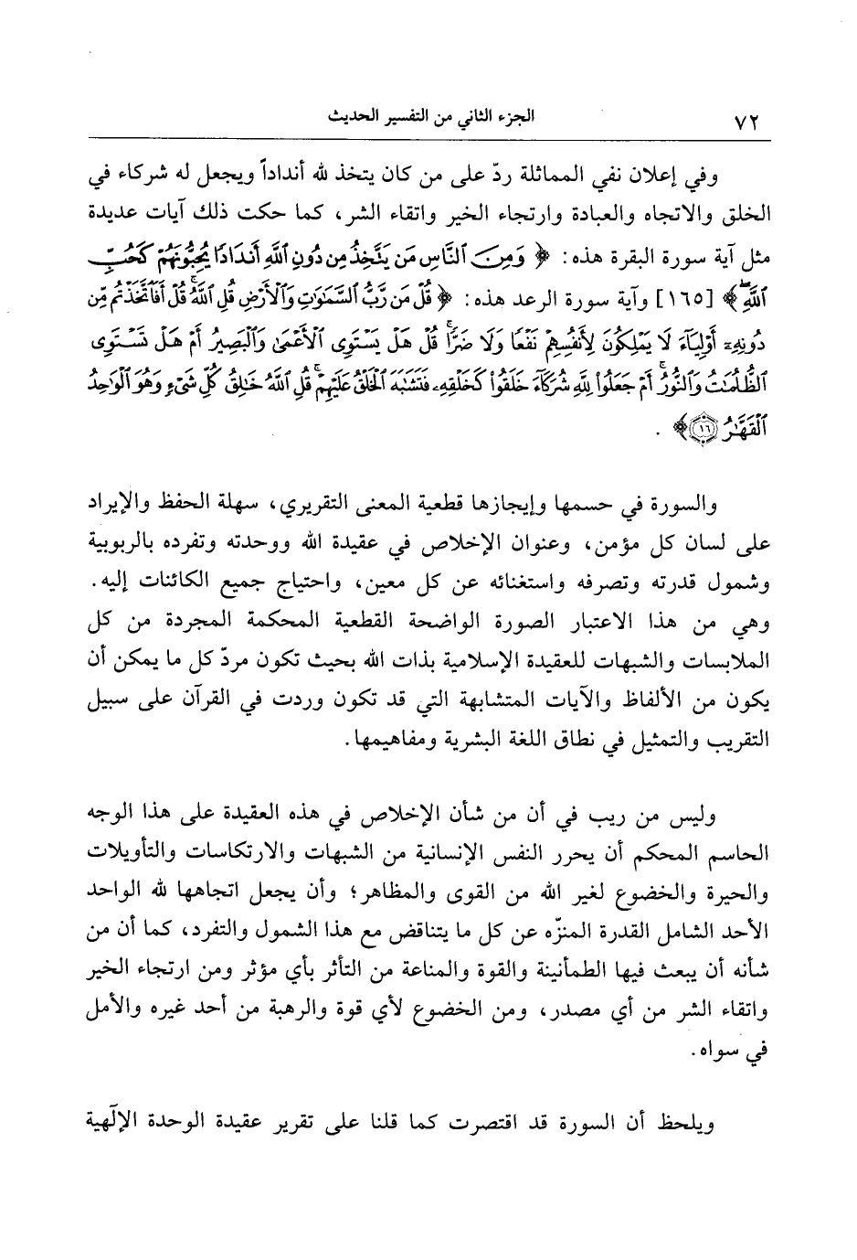 وليس من ريب في أن من شأن الإخلاص في هذه العقيدة على هذا الوجه الحاسم المحكم أن يحرر النفس الإنسانية من الشبهات والارتكاسات والتأويلات والحيرة والخضوع لغير الله من القوى والمظاهر وأن يجعل اتجاهها لله الواحد الأحد الشامل القدرة المنزّه عن كل ما يتناقض مع هذا الشمول والتفرد، كما أن من شأنه أن يبعث فيها الطمأنينة والقوة والمناعة من التأثر بأي مؤثر ومن ارتجاء الخير واتقاء الشر من أي مصدر، ومن الخضوع لأي قوة والرهبة من أحد غيره والأمل في سواه.