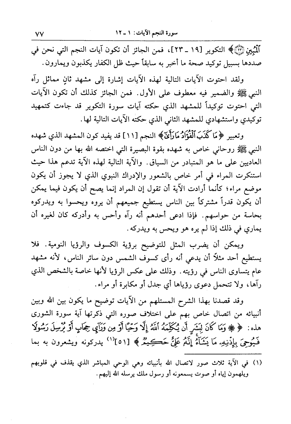 وتعبير ما كَذَبَ الْفُؤادُ ما رَأى النجم [11] قد يفيد كون المشهد الذي شهده النبي صلّى الله عليه وسلّم روحاني خاص به شهده بقوة البصيرة التي اختصه الله بها من دون الناس العاديين على ما هو المتبادر من السياق. والآية التالية لهذه الآية تدعم هذا حيث استنكرت المرء في أمر خاص بالشعور والإدراك النبوي الذي لا يجوز أن يكون موضع مراء كأنما أرادت الآية أن تقول إن المراد إنما يصح أن يكون فيما يمكن أن يكون قدرا مشتركا بين الناس يستطيع جميعهم أن يروه ويحسوا به ويدركوه بحاسة من حواسهم. فإذا ادعى أحدهم أنه رآه وأحس به وأدركه كان لغيره أن يماري في ذلك إذا لم يره هو ويحس به ويدركه.