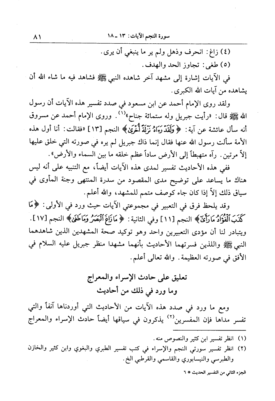 (2) انظر تفسير سورتي النجم والإسراء في كتب تفسير الطبري والبغوي وابن كثير والخازن والطبرسي والنيسابوري والقاسمي والقرطبي إلخ.