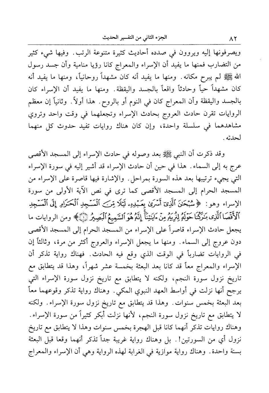 ويصرفونها إليه ويروون في صدده أحاديث كثيرة متنوعة الرتب. وفيها شيء كثير من التضارب فمنها ما يفيد أن الإسراء والمعراج كانا رؤيا منامية وأن جسد رسول الله صلّى الله عليه وسلّم لم يبرح مكانه. ومنها ما يفيد أنه كان مشهدا روحانيا، ومنها ما يفيد أنه كان مشهدا حيا وحادثا واقعا بالجسد واليقظة. ومنها ما يفيد أن الإسراء كان بالجسد واليقظة وأن المعراج كان في النوم أو بالروح. هذا أولا. وثانيا إن معظم الروايات تقرن حادث العروج بحادث الإسراء وتجعلهما في وقت واحد وتروي مشاهدهما في سلسلة واحدة، وإن كان هناك روايات تفيد حدوث كل منهما لحدته.