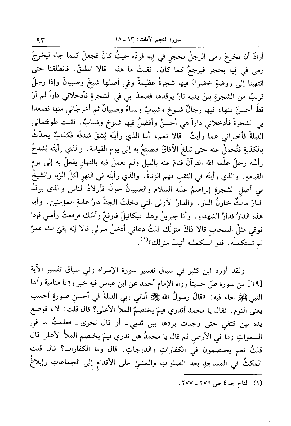 ولقد أورد ابن كثير في سياق تفسير سورة الإسراء وفي سياق تفسير الآية [69] من سورة ص حديثا رواه الإمام أحمد عن ابن عباس فيه خبر رؤيا منامية رآها النبي صلّى الله عليه وسلّم جاء فيه: «قال رسول الله صلّى الله عليه وسلّم أتاني ربي الليلة في أحسن صورة أحسب يعني النوم. فقال يا محمد أتدري فيم يختصم الملأ الأعلى؟ قال قلت: لا، فوضع يده بين كتفي حتى وجدت بردها بين ثديي- أو قال نحري- فعلمت ما في السموات وما في الأرض ثم قال يا محمد هل تدري فيم يختصم الملأ الأعلى قال قلت نعم يختصمون في الكفارات والدرجات. قال وما الكفارات؟ قال قلت المكث في المساجد بعد الصلوات والمشي على الأقدام إلى الجماعات وإبلاغ
