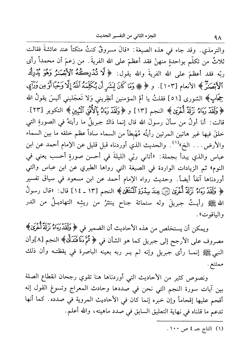 والترمذي. وقد جاء في هذه الصيغة: «قال مسروق كنت متكئا عند عائشة فقالت ثلاث من تكلّم بواحدة منهنّ فقد أعظم على الله الفرية. من زعم أن محمدا رأى ربّه فقد أعظم على الله الفرية والله يقول: لا تُدْرِكُهُ الْأَبْصارُ وَهُوَ يُدْرِكُ الْأَبْصارَ الأنعام [103] . ووَ ما كانَ لِبَشَرٍ أَنْ يُكَلِّمَهُ اللَّهُ إِلَّا وَحْياً أَوْ مِنْ وَراءِ حِجابٍ الشورى [51] فقلت يا أمّ المؤمنين أنظريني ولا تعجليني أليس يقول الله وَلَقَدْ رَآهُ نَزْلَةً أُخْرى النجم [13] ووَ لَقَدْ رَآهُ بِالْأُفُقِ الْمُبِينِ التكوير [23] .