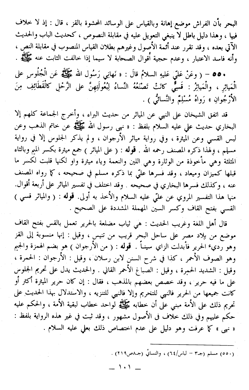 550 - (وَعَنْ عَلِيٍّ - عَلَيْهِ السَّلَامُ - قَالَ: «نَهَانِي رَسُولُ اللَّهِ - صَلَّى اللَّهُ عَلَيْهِ وَسَلَّمَ - عَنْ الْجُلُوسِ عَلَى الْمَيَاثِرِ، وَالْمَيَاثِرُ: قِسِيٌّ كَانَتْ تَصْنَعُهُ النِّسَاءُ لِبُعُولَتِهِنَّ عَلَى الرَّحْلِ كَالْقَطَائِفِ مِنْ الْأُرْجُوَانِ» رَوَاهُ مُسْلِمٌ وَالنَّسَائِيُّ)