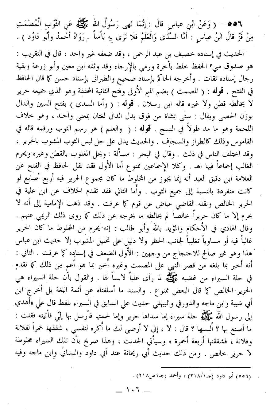 556 - (وَعَنْ ابْنِ عَبَّاسٍ قَالَ: إنَّمَا «نَهَى رَسُولُ اللَّهِ - صَلَّى اللَّهُ عَلَيْهِ وَسَلَّمَ - عَنْ الثَّوْبِ الْمُصْمَتِ مِنْ قَزٍّ» قَالَ ابْنُ عَبَّاسٍ: أَمَّا السَّدَى وَالْعَلَمُ فَلَا نَرَى بِهِ بَأْسًا. رَوَاهُ أَحْمَدُ وَأَبُو دَاوُد)
