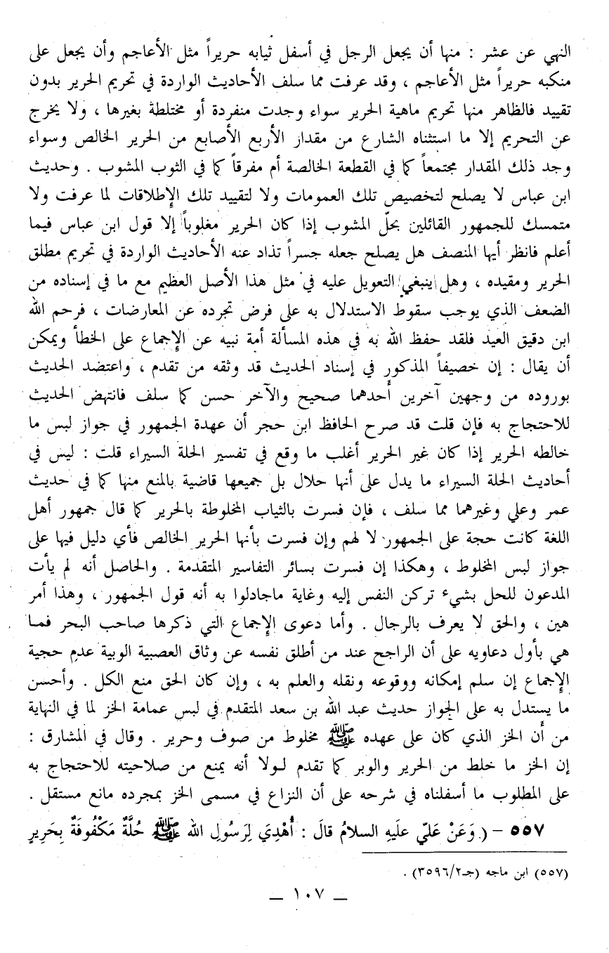 557 - (وَعَنْ عَلِيٍّ - عَلَيْهِ السَّلَامُ - قَالَ: «أُهْدِيَ لِرَسُولِ اللَّهِ - صَلَّى اللَّهُ عَلَيْهِ وَسَلَّمَ - حُلَّةٌ مَكْفُوفَةٌ بِحَرِيرٍ إمَّا سَدَاهَا وَإِمَّا لَحْمَتُهَا فَأَرْسَلَ بِهَا إلَيَّ فَأَتَيْتُهُ، فَقُلْت: يَا رَسُولَ اللَّهِ مَا أَصْنَعُ بِهَا أَلْبَسُهَا؟ قَالَ: لَا، وَلَكِنْ اجْعَلْهَا خُمُرًا بَيْنَ الْفَوَاطِمِ» . رَوَاهُ ابْنُ مَاجَهْ)