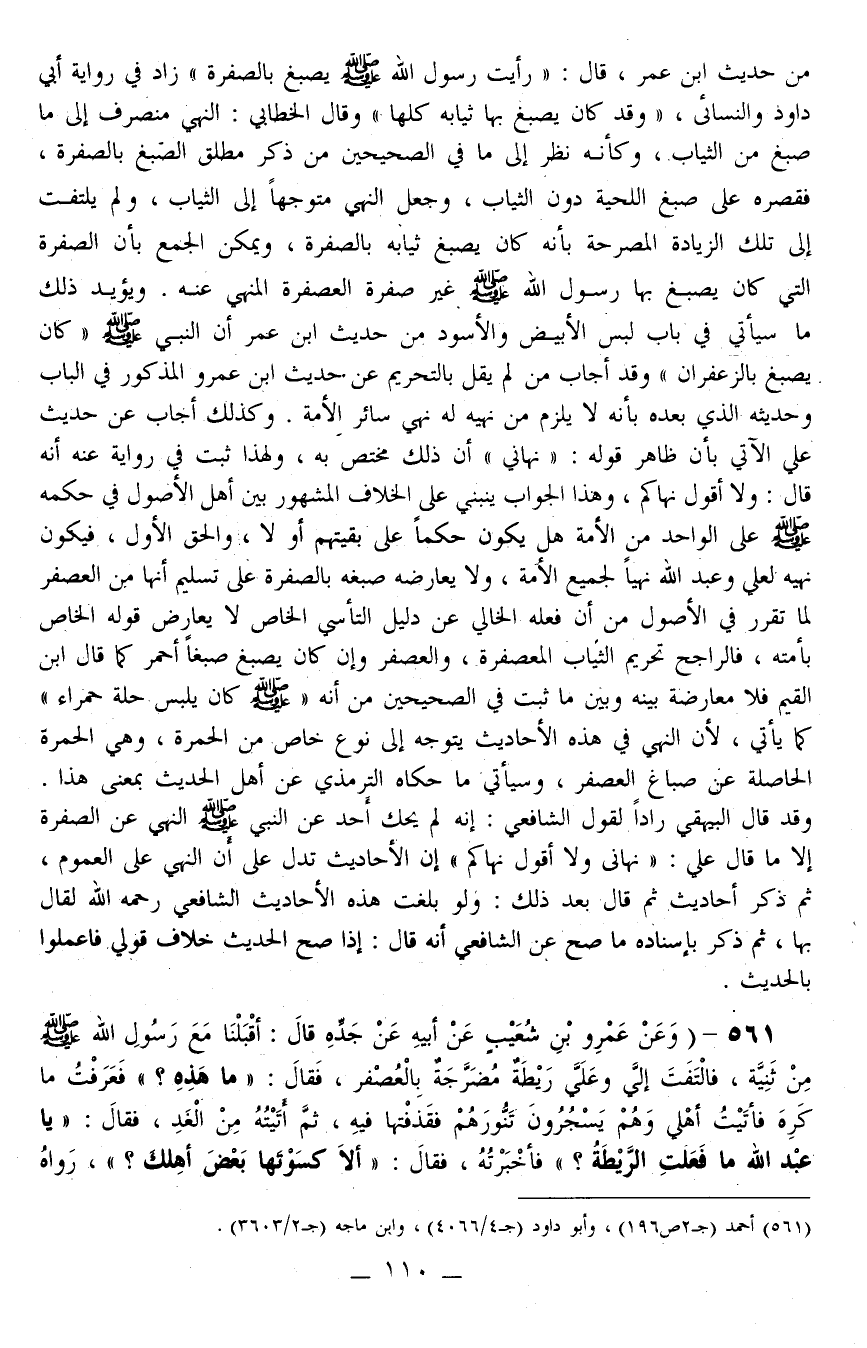 561 - (وَعَنْ عَمْرِو بْنِ شُعَيْبٍ عَنْ أَبِيهِ عَنْ جَدِّهِ قَالَ: «أَقْبَلْنَا مَعَ رَسُولِ اللَّهِ - صَلَّى اللَّهُ عَلَيْهِ وَسَلَّمَ - مِنْ ثَنِيَّةٍ، فَالْتَفَتَ إلَيَّ وَعَلَيَّ رَيْطَةٌ مُضَرَّجَةٌ بِالْعُصْفُرِ، فَقَالَ: مَا هَذِهِ؟ فَعَرَفْت مَا كَرِهَ فَأَتَيْت أَهْلِي وَهُمْ يَسْجُرُونَ تَنُّورَهُمْ فَقَذَفْتهَا فِيهِ، ثُمَّ أَتَيْتُهُ مِنْ الْغَدِ، فَقَالَ: يَا عَبْدَ اللَّهِ مَا فَعَلَتْ الرَّيْطَةُ؟ فَأَخْبَرْته، فَقَالَ: أَلَا كَسَوْتَهَا بَعْضَ أَهْلِكِ؟» ، رَوَاهُ أَحْمَدُ وَكَذَلِكَ أَبُو دَاوُد وَابْنُ مَاجَهْ وَزَادَ: " فَإِنَّهُ لَا بَأْسَ بِذَلِكَ لِلنِّسَاءِ ") .