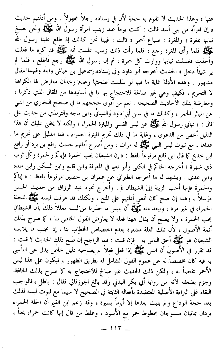 نَعَمْ مِنْ أَقْوَى حُجَجِهِمْ مَا فِي صَحِيحِ الْبُخَارِيِّ مِنْ النَّهْيِ عَنْ الْمَيَاثِرِ الْحُمْرِ، وَكَذَلِكَ مَا فِي سُنَنِ أَبِي دَاوُد وَالنَّسَائِيُّ وَابْنِ مَاجَهْ وَالتِّرْمِذِيِّ مِنْ حَدِيثِ عَلِيٍّ قَالَ: «نَهَانِي رَسُولُ اللَّهِ - صَلَّى اللَّهُ عَلَيْهِ وَسَلَّمَ - عَنْ لُبْسِ الْقَسِّيِّ وَالْمِيثَرَةِ الْحَمْرَاءِ» وَلَكِنَّهُ لَا يَخْفَى عَلَيْك أَنَّ هَذَا الدَّلِيلَ أَخَصُّ مِنْ الدَّعْوَى، وَغَايَةُ مَا فِي ذَلِكَ تَحْرِيمُ الْمِيثَرَةِ الْحَمْرَاءِ، فَمَا الدَّلِيلُ عَلَى تَحْرِيمِ مَا عَدَاهَا، مَعَ ثُبُوتِ لُبْسِ النَّبِيِّ - صَلَّى اللَّهُ عَلَيْهِ وَسَلَّمَ - لَهُ مَرَّاتٍ، وَمِنْ أَصْرَحِ أَدِلَّتِهِمْ حَدِيثُ رَافِعِ بْنِ بُرْدٍ أَوْ رَافِعِ بْنِ خَدِيجٍ كَمَا قَالَ ابْنُ قَانِعٍ مَرْفُوعًا بِلَفْظِ: «إنَّ الشَّيْطَانَ يُحِبُّ الْحُمْرَةَ فَإِيَّاكُمْ وَالْحُمْرَةَ وَكُلَّ ثَوْبٍ ذِي شُهْرَةٍ» أَخْرَجَهُ الْحَاكِمُ فِي الْكُنَى وَأَبُو نُعَيْمٍ فِي الْمَعْرِفَةِ وَابْنُ قَانِعٍ وَابْنُ السَّكَنِ وَابْنُ مَنْدَهْ وَابْنُ عَدِيٍّ. وَيَشْهَدُ لَهُ مَا أَخْرَجَهُ الطَّبَرَانِيُّ عَنْ عِمْرَانَ بْنِ حُصَيْنٍ مَرْفُوعًا بِلَفْظِ: «إيَّاكُمْ وَالْحُمْرَةَ فَإِنَّهَا أَحَبُّ الزِّينَةِ إلَى الشَّيْطَانِ.» وَأَخْرَجَ نَحْوَ عَبْدُ الرَّزَّاقِ مِنْ حَدِيثِ الْحَسَنِ مُرْسَلًا وَهَذَا إنْ صَحَّ كَانَ أَنَصَّ أَدِلَّتِهِمْ عَلَى الْمَنْعِ، وَلَكِنَّك قَدْ عَرَفْت لُبْسَهُ - صَلَّى اللَّهُ عَلَيْهِ وَسَلَّمَ - لِلْحُلَّةِ الْحَمْرَاءِ فِي غَيْرِ مَرَّةٍ، وَيَبْعُدُ مِنْهُ - صَلَّى اللَّهُ عَلَيْهِ وَسَلَّمَ - أَنْ يَلْبَسَ مَا حَذَّرَنَا مِنْ لُبْسِهِ مُعَلِّلًا ذَلِكَ بِأَنَّ الشَّيْطَانَ يُحِبُّ الْحُمْرَةَ، وَلَا يَصِحُّ أَنْ يُقَالَ هَهُنَا فِعْلُهُ لَا يُعَارِضُ الْقَوْلَ الْخَاصَّ بِنَا، كَمَا صَرَّحَ بِذَلِكَ أَئِمَّةُ الْأُصُولِ، لِأَنَّ تِلْكَ الْعِلَّةَ مُشْعِرَةٌ بِعَدَمِ اخْتِصَاصِ الْخِطَابِ بِنَا، إذْ تَجَنُّبُ مَا يُلَابِسُهُ الشَّيْطَانُ هُوَ - صَلَّى اللَّهُ عَلَيْهِ وَسَلَّمَ - أَحَقُّ النَّاسِ بِهِ.